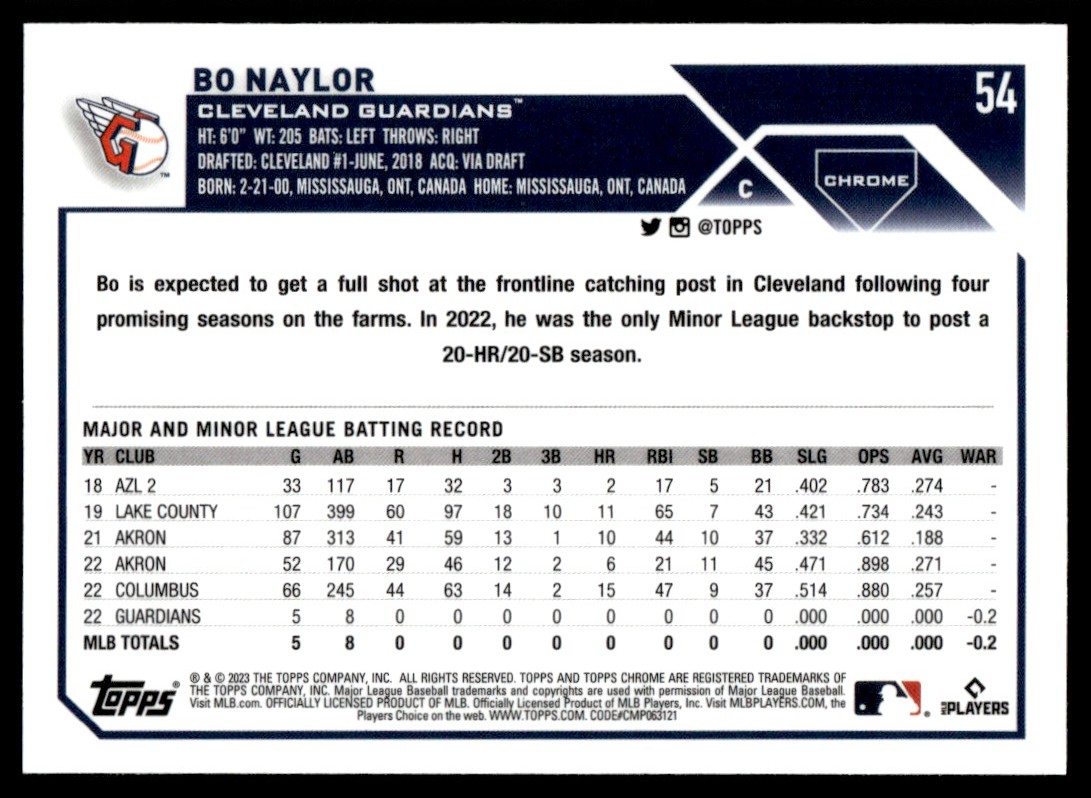 | 2023 Topps Chrome Pink Refractor Bo Naylor RC Cleveland Guardians #54 |