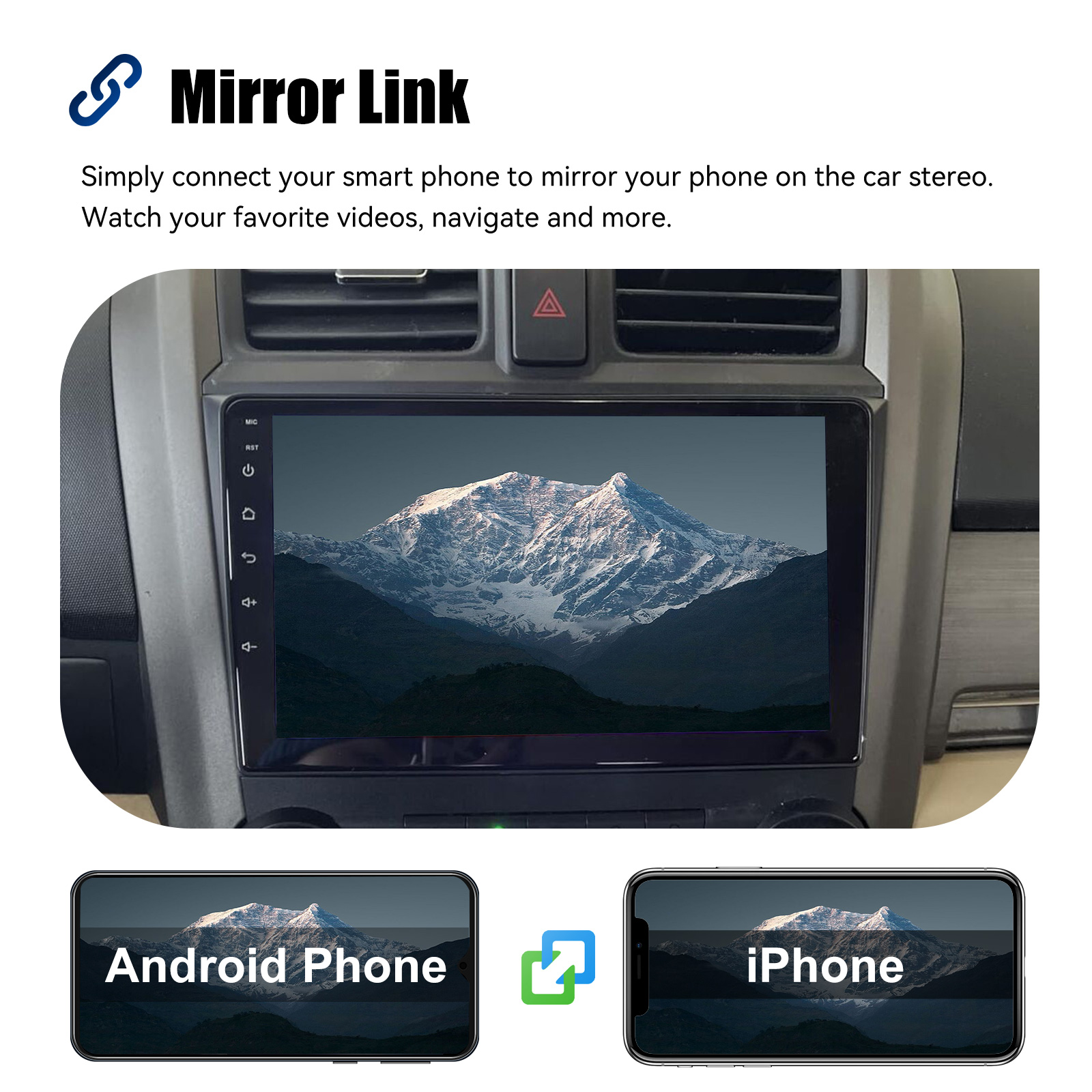 MIRROR LINK & APPLE CARPLAY & ANDROID AUTO: With this car radio, you can experience the amazing Mirror Link function, compatible with iOS and Android phones. You can mirror your smartphone screen to the car radio using apps like Google Maps, Spotify, Youtube, etc. Replace your cell phone with the car screen and turn your vehicle into a smart platform. Immerse yourself in a seamless and user-friendly infotainment experience with Apple CarPlay & Android Auto. Connect your iPhone to Apple CarPlay or your Android smartphone to Android Auto and securely access calls, texts, navigation, music and more. With intuitive operation via the touchscreen or voice control, you have all functions at your fingertips while you remain safely at the wheel. Use your favorite apps and stay connected at all times while keeping your eyes on the road. Turn your vehicle into an extended hub for your mobile devices and experience a new dimension in infotainment.