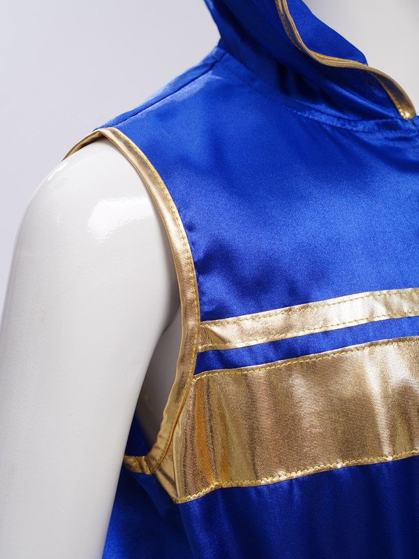 Boy’s boxing top with color block patchwork and metallic trim is eye-catching enough to stand out in the crowd.