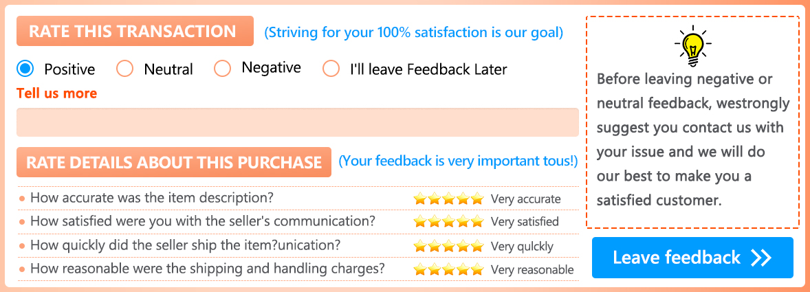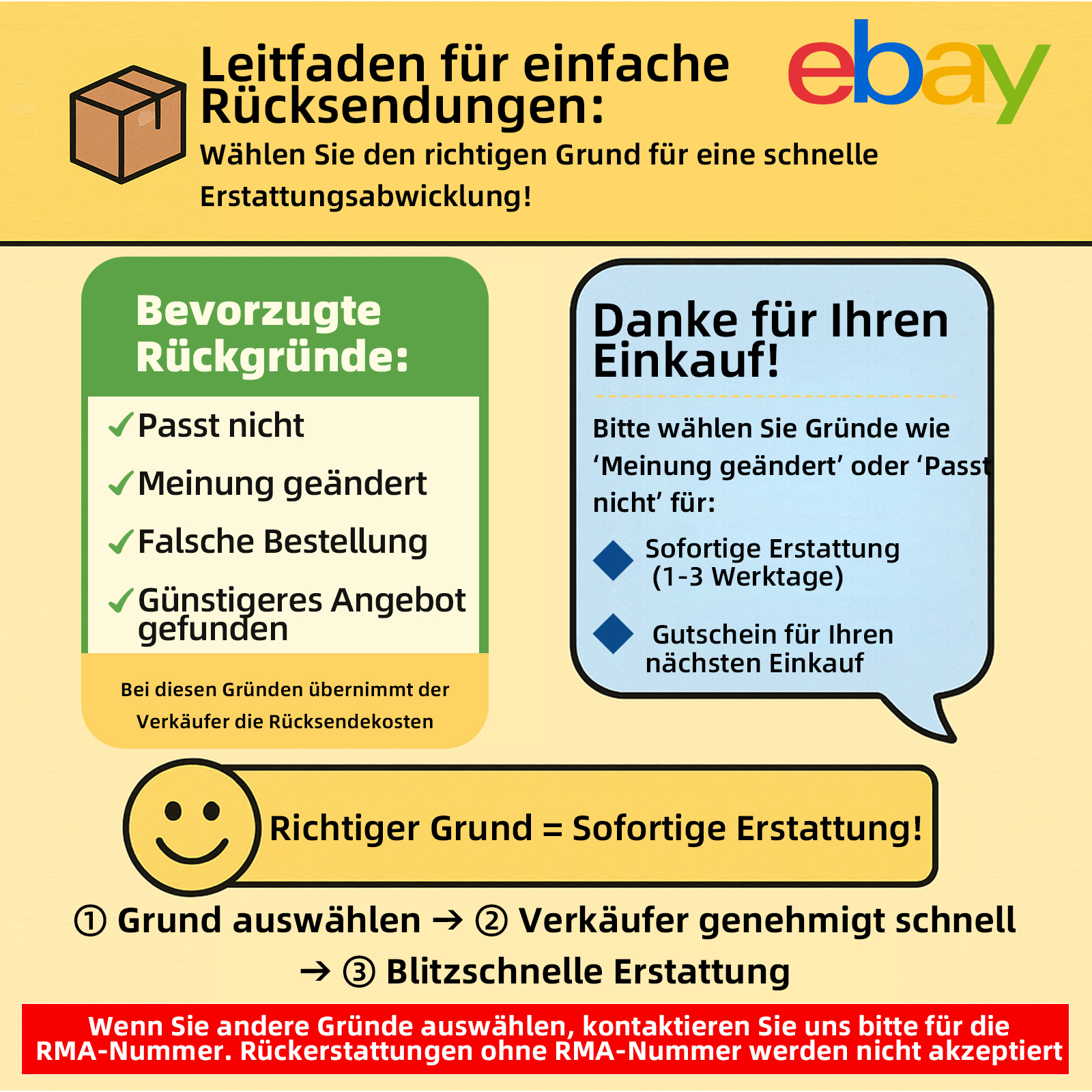 1. Akzeptieren Sie nur Paypal 2. Alle gängigen Kreditkarten werden über unseren sicheren Zahlungsprozessor PayPal akzeptiert. 3. Wir versenden zu Ihrer Paypaladresse. Bitte stellen Sie sicher, dass Ihre Paypal-Adresse korrekt ist, bevor Sie bezahlen.Bitte stellen Sie sicher, dass Ihre eBay-Lieferadresse für Ihren Empfang korrekt ist.Wir versuchen unser Bestes, um jeden möglichen Streit zu lösen und unser Bestes zu versuchen, Sie zu befriedigen. Wenn Sie mit unserem Produkt nicht zufrieden sind, kontaktieren Sie bitte zuerst. Wir akzeptieren gerne eine Rücksendung und geben eine volle Rückerstattung (abzüglich Versandkosten) für jeden Artikel. Der Artikel muss im Originalzustand mit intaktem Gesundheits- und Hygienesiegel an uns zurückgegeben werden. Wenn Sie es nicht innerhalb der Lieferzeit haben, zögern Sie bitte nicht uns zu kontaktieren. Wir werden es für Sie mit der Post und Zoll überprüfen. Weil es manchmal wegen Verkehr oder Flugstaus verzögert wird. Bitte öffnen Sie keine Unstimmigkeiten. Wir übernehmen die Verantwortung für die erneute Sendung oder Rückerstattung für verlorene Gegenstände.Bitte kontaktieren Sie uns in jedem Fall rechtzeitig. Wir freuen uns über Ihr positives Feedback und wir werden Ihnen das gleiche tun. Wir interessieren uns für unsere geschätzten Kunden und werden immer unser Bestes versuchen, um Ihnen zu helfen, wenn Sie irgendwelche Probleme haben. Arbeitszeit: GMT + 8/9: 00-18: 30 normal antworten wir Ihnen an einem Arbeitstag.