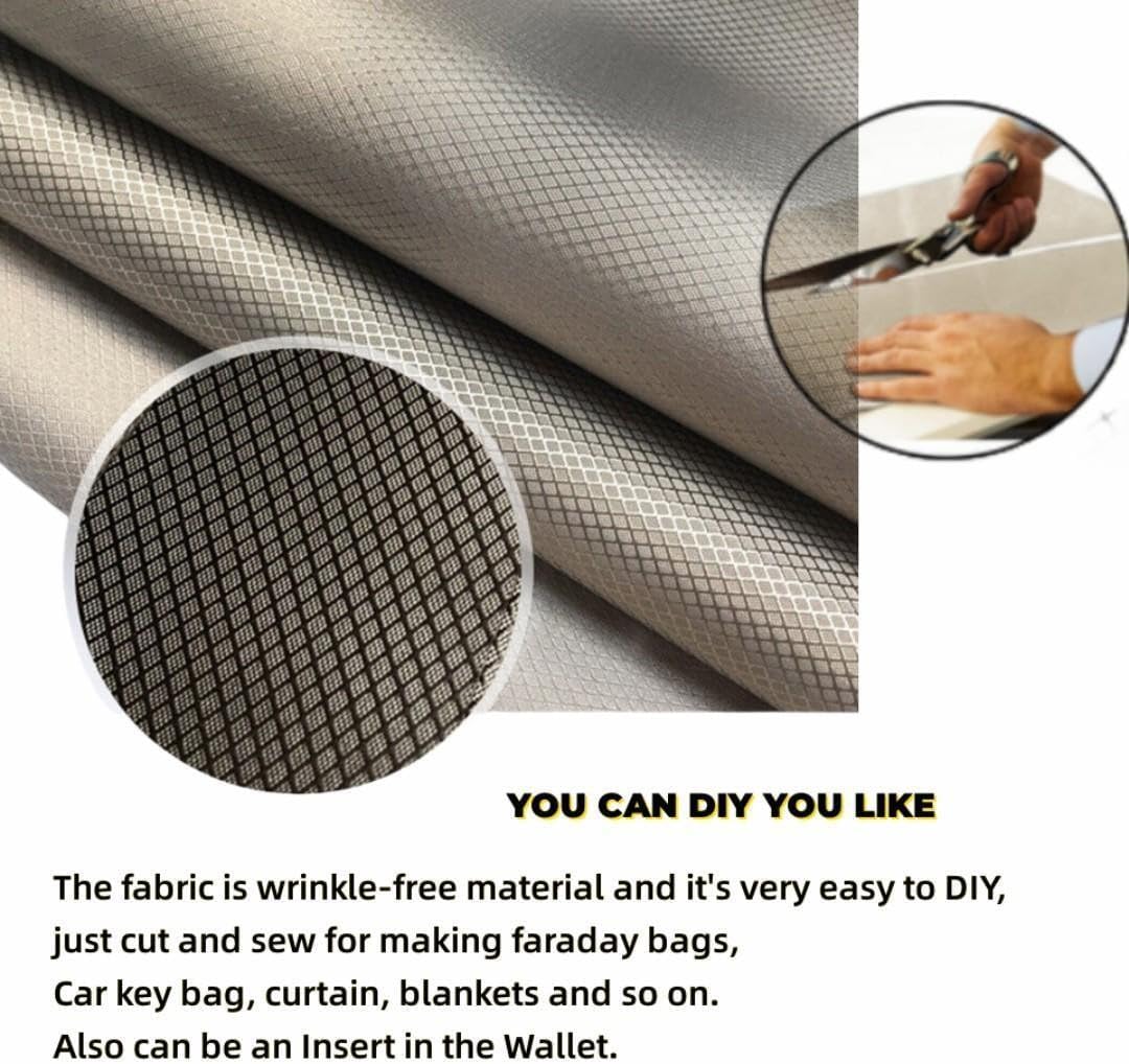 ✅【99% BLOCKING EFFICIENCY】High shielding faraday fabric is made of copper+nickel+polyester that forming a conductive grid similar to a faraday cage. Use it as an insert in your wallet or handbag to protect your credit cards and personal information from data theft ✅【SUITABLE FOR DIY】The fabric is wrinkle-free material and it is very easy to DIY, just cut and sew for making faraday bags, Car key bag, curtain, blanket, maternity clothes, passport covers and mainframe chassis covers so on. The fabric could be made anything you could imagine ✅【Washing Instructions】To ensure the optimal blocking effect, exercise caution to prevent fabric damage. Hand wash gently using a neutral detergent; refrain from machine washing, twisting, and prolonged exposure to direct sunlight. Note that the faraday fabric may darken when wet; our recommendation is to minimize washing or avoid it whenever possible to preserve its integrity ✅【NICE GIFT】With more and more hackers intruding in our society,Using our Copper Faraday Fabric to upgrade your health and privacy protection, giving blocking fabric as a gift to our friends and family is a good choice to help them better protect their privacy ✅【Super Simple Test】If you don't have specialized testing equipment to test if faraday cloth works. Don't worry, you can do this. First, remove the faraday fabric and wrap the phone tightly in the fabric like a faraday box, leaving no gaps. Wait 30-40 seconds and call your cell phone, which will not connect!
