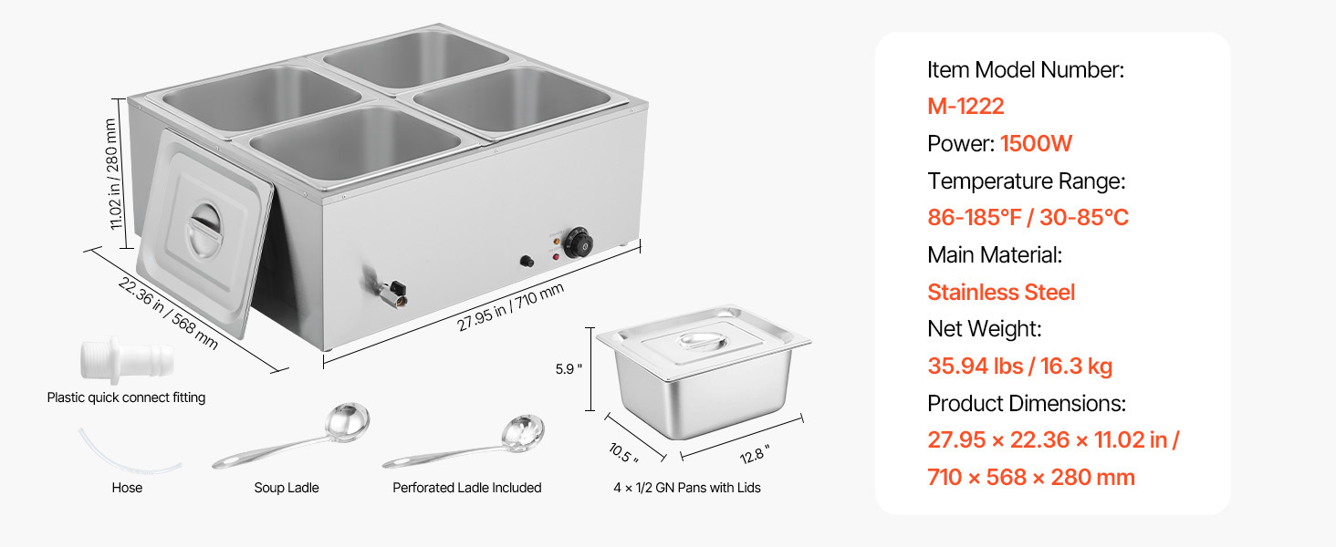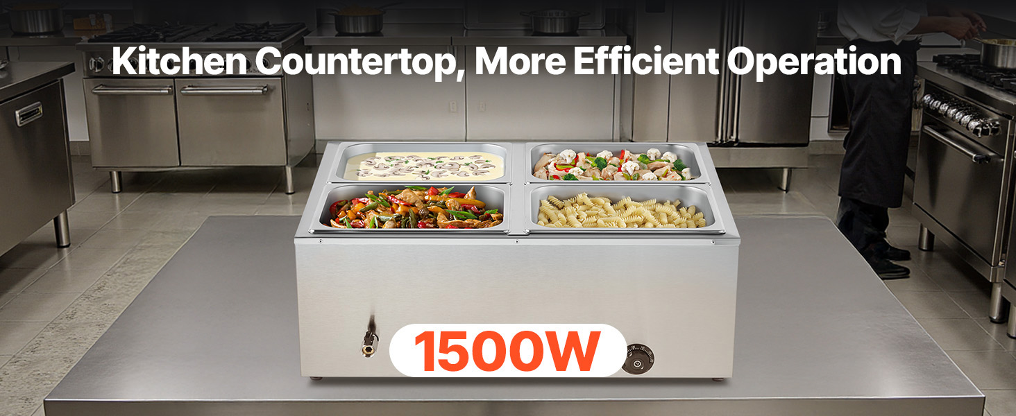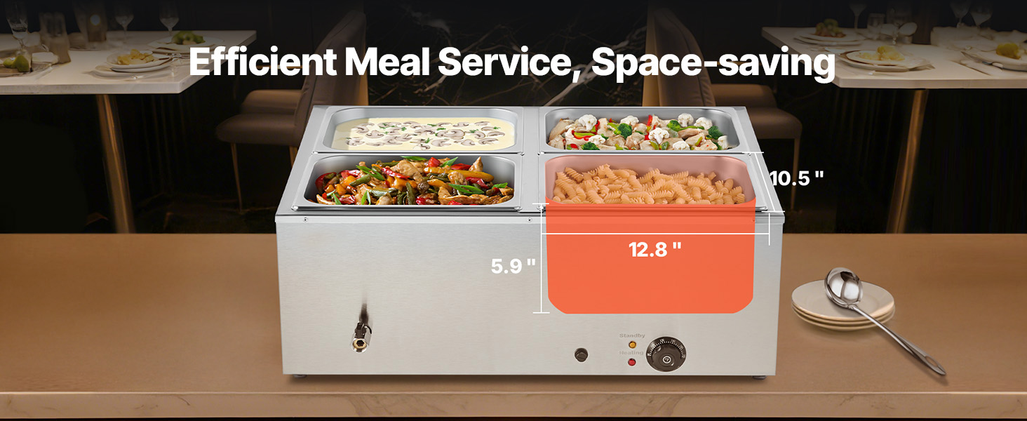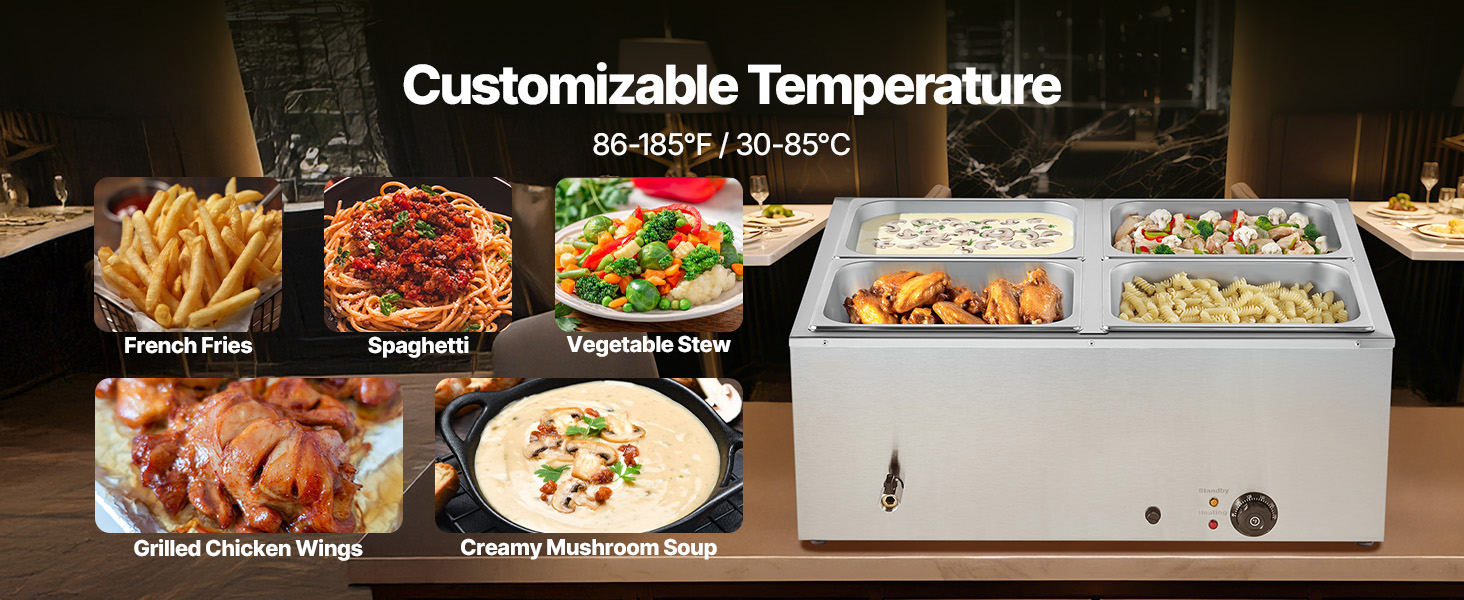 - Spacious Design: Featuring a 5.9-inch depth, this buffet bain marie includes 4 half-size pans that fit perfectly into the compartments. The pans can be easily interchanged or combined, allowing you to serve a variety of dishes such as soups, sauces, stews, melted cheese, or chocolate.