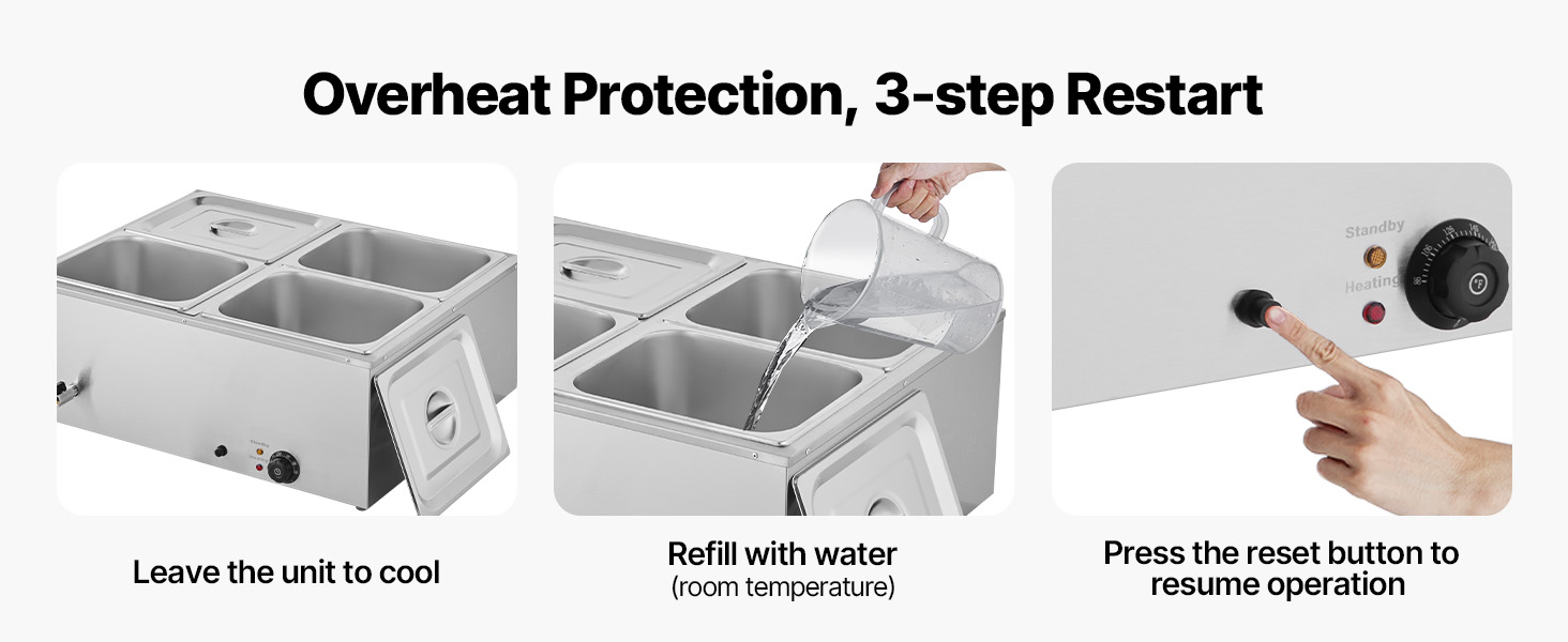 - Automatic Safety Shutoff: The food warmer halts heating automatically when the temperature exceeds 248°F (120°C). To resume operation, refill the unit with water and press the reset button. Do not use ice water, as it may harm the heating element.