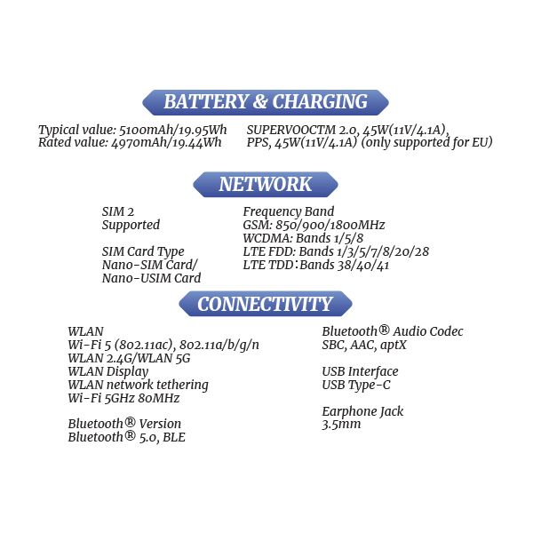 - 45W SUPERVOOC Flash Charge provides fast charging with smart safety protections.