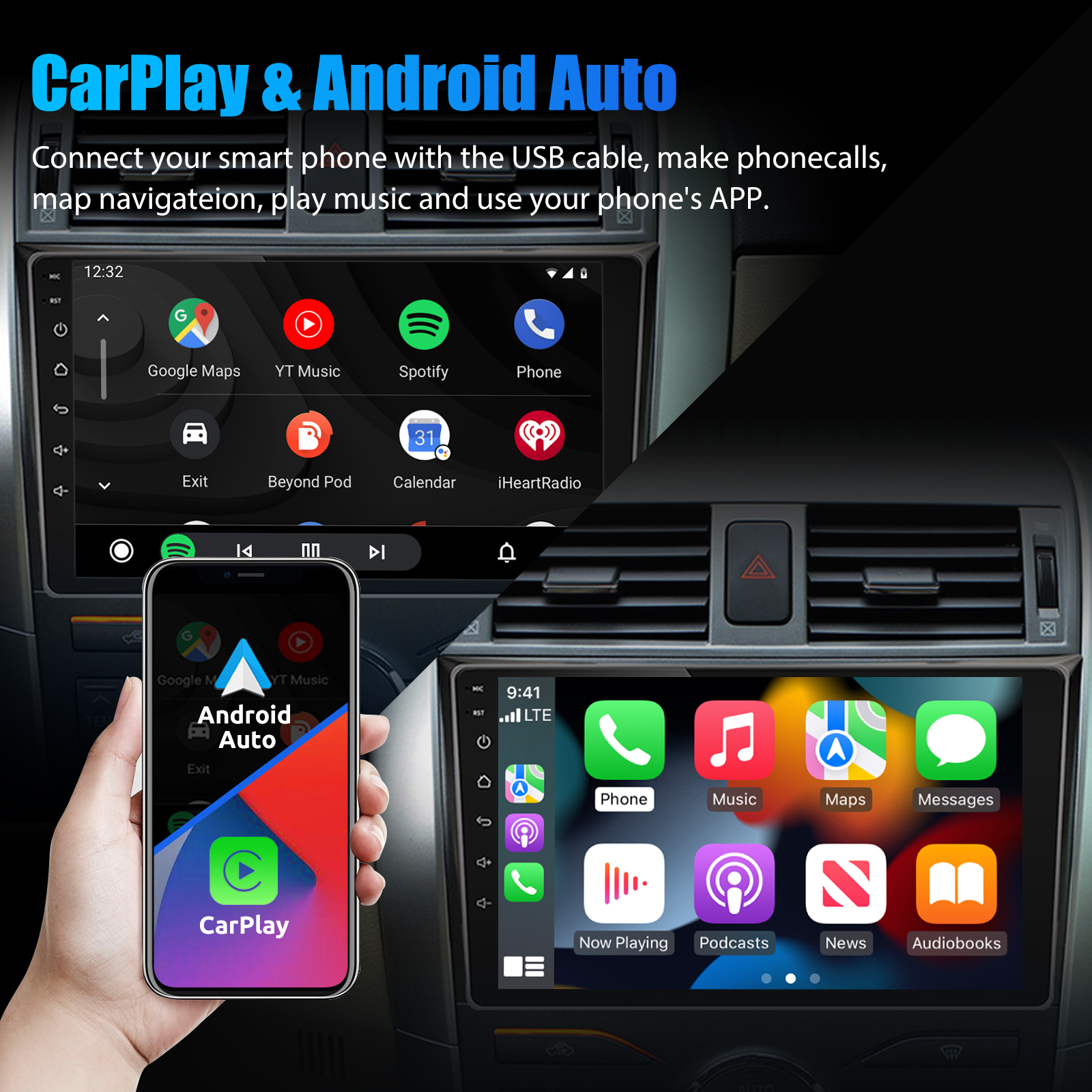 MIRROR LINK & APPLE CARPLAY & ANDROID AUTO: With this car radio, you can experience the amazing Mirror Link function, compatible with iOS and Android phones. You can mirror your smartphone screen to the car radio using apps like Google Maps, Spotify, Youtube, etc. Replace your cell phone with the car screen and turn your vehicle into a smart platform. Immerse yourself in a seamless and user-friendly infotainment experience with Apple CarPlay & Android Auto. Connect your iPhone to Apple CarPlay or your Android smartphone to Android Auto and securely access calls, texts, navigation, music and more. With intuitive operation via the touchscreen or voice control, you have all functions at your fingertips while you remain safely at the wheel. Use your favorite apps and stay connected at all times while keeping your eyes on the road. Turn your vehicle into an extended hub for your mobile devices and experience a new dimension in infotainment.