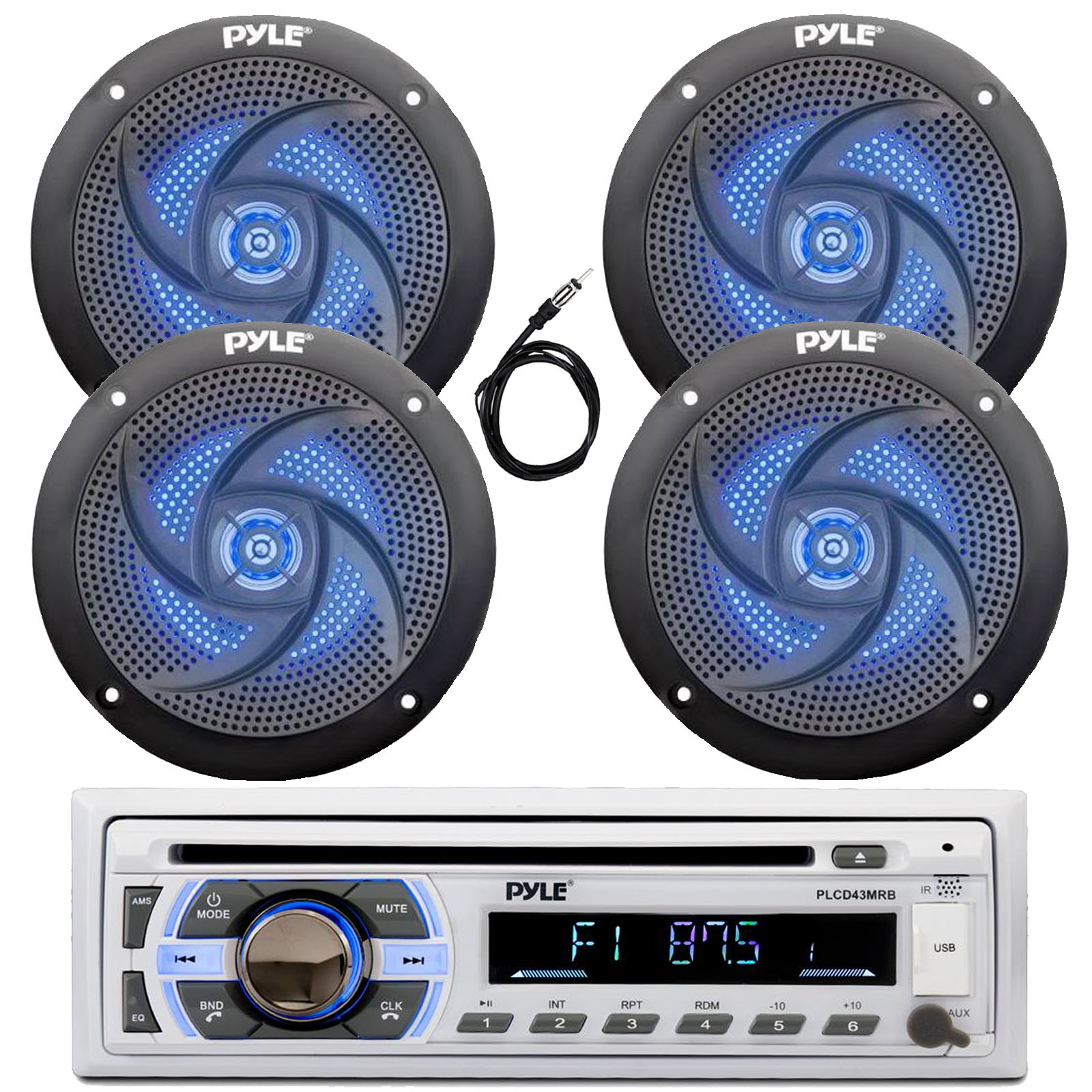 Pyle PLCD43MRB Single Din Marine MP3/USB/AUX Bluetooth AM/FM CD Stereo Receiver, 4x 5.25" 180 Watt Max 2-Way Low Profile Blue Flashing LED Waterproof Boat Audio Speakers (Black), 22" Antenna