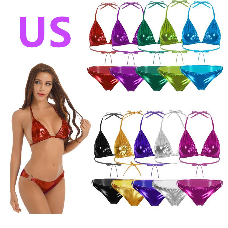 Metallic shiny bikini set just covers up private parts, which brings endless sexy and charming. It will be a nice choice for pool and beach.
