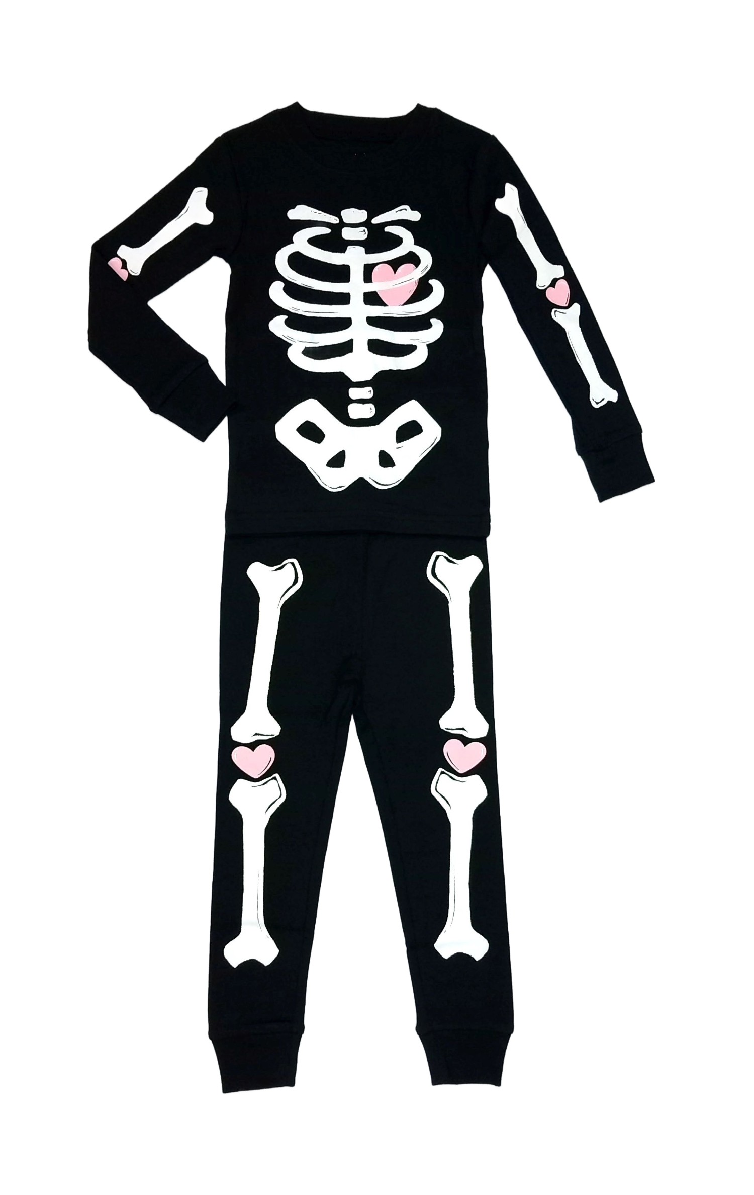 Crafted from soft cotton, this Halloween skeleton pajama set guarantees she'll stay comfy and cozy throughout the haunting season. It features glow-in-the-dark 'bones' and cute pink heart applique accents for a spookily fun look.