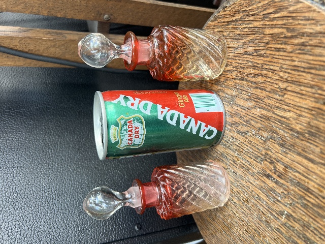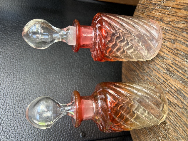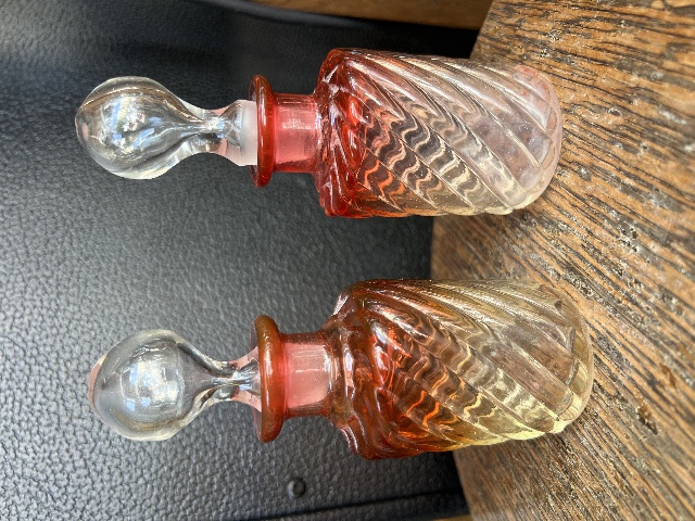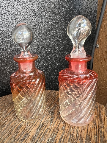 We are offering antique pair of glass perfume bottles, measuring about 5.5” tall (4” without the stopper) and 1.75” in diameter. This pair is in the iconic Baccarat Rose Tiente hue, red to clear, with a swirl design that accentuates the gradient. Under a UV light, they glow with a distinct cadmium orange. This pair is the perfect addition to any collection!