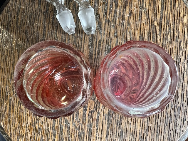 Antique Baccarat Glass Perfume Bottle Pair w Stoppers Rose Tiente Cadmium Swirl 5.5”