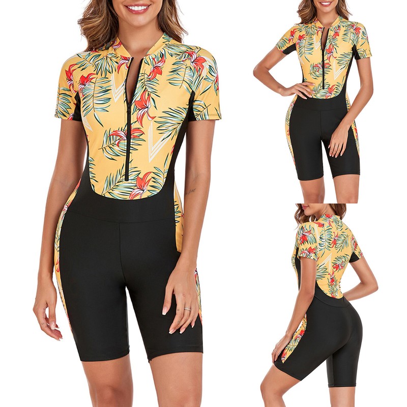 An one-piece sport swimsuit for women, designed with short sleeve, ensures free movement.