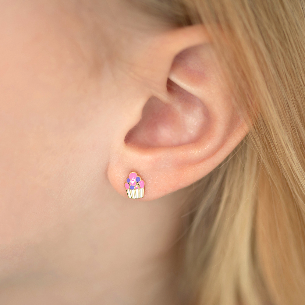 Adorable 14k yellow gold cupcake earrings for little girls! These precious earrings were beautifully hand painted using child safe material with an array of fun colors. Featuring a unique safety screw back system, the threaded earrings posts and threaded earring back help to ensure your little girl's 14k gold earrings will stay safely and comfortably in place. Giving these 14k gold screw back earrings as a gift? A complimentary gift box is included!