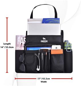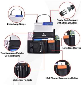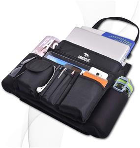 - Smart, Accessible Seat Front Organizer – This car organizer front seat has all-in-one storage options for travelers and on-the-go professions this seat organizer has pockets and sleeves for a laptop or tablet, file folders, documents, smartphone, pens, water bottles, and an umbrella.