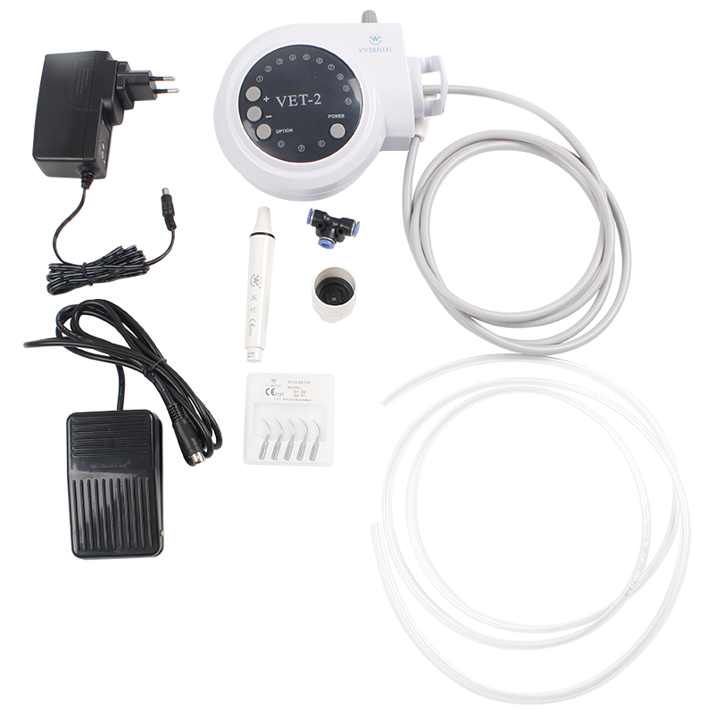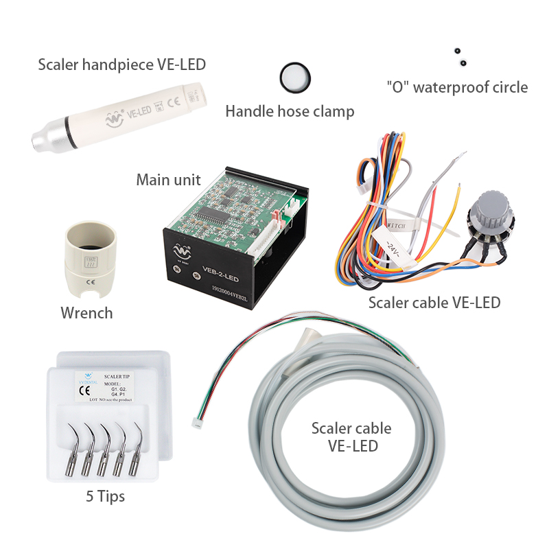 Packing list One handpiece One cable Five pcs scaler tip(Scaling,Perio tip) One Torque wrench One Foot switch One Power supply One water pipe