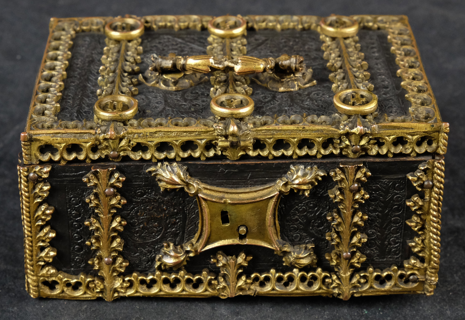 Der rechteckige Korpus besteht aus Eichenholz, welcher mit reich graviertem Leder überzogen ist. Die Ornamentik ist ganz im Stile der Gotik gehalten. Deckel und Seiten sind mit aufwendiger Messingapplikation versehen und an zwei Scharnieren befestigt, der Boden des Kästchens mit einer Messingplatte mit Rautenmuster, die Applikationen stellen Akanthusblattwerk dar. Front mit gotischem Schlossbeschlag, ohne Schlüssel.