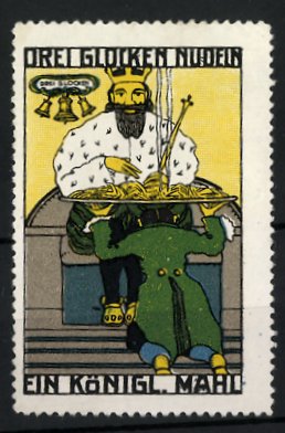 Reklamemarke Drei Glocken-Nudeln, ein königl. Mahl, Diener bringt dem König Nudeln auf einem Tablett