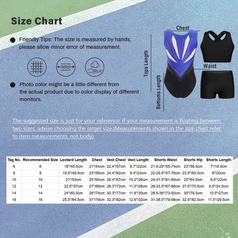 | Tag No. | Recommended Size | Leotard Length | Chest | Vest Chest | Vest Length | Shorts Waist | Shorts Hip | Shorts Length |