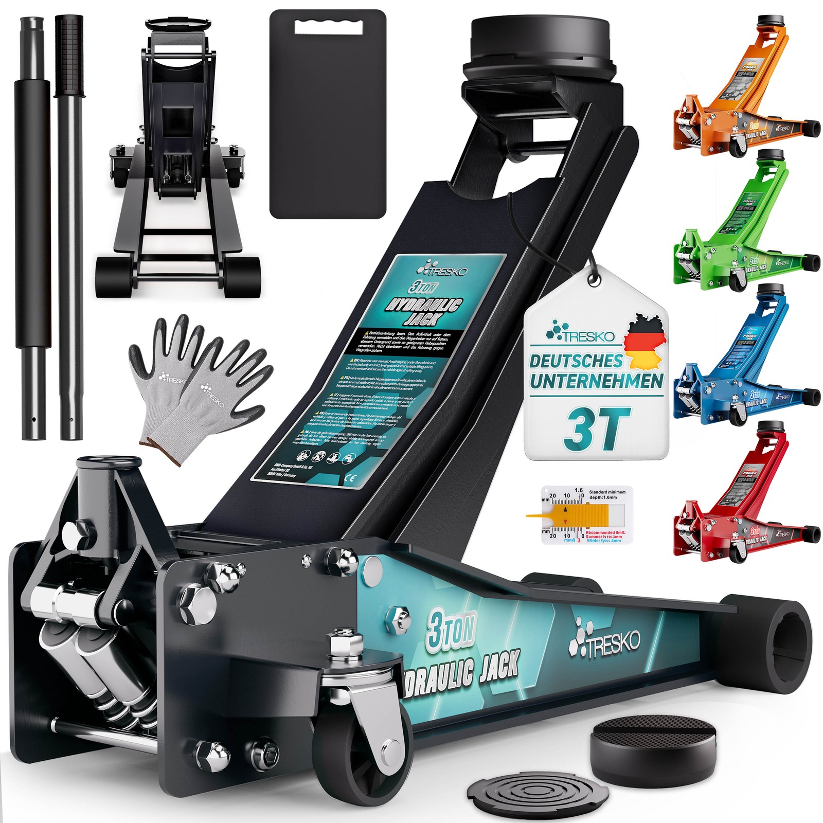 TRESKO® Wagenheber hydraulisch 3T Hubhöhe 75-510mm| Hydraulik KFZ Rangierwagenheber flach Doppelkolben & 360° Rollen inkl. 2X Gummiauflage, Schutzmatte, Handschuhe