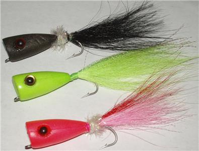 THIS IS A SELECTION OF 3 HARD FOAM BASS FLIES THESE FLIES ARE 3.5-4" LOA AND WEIGH 1/10 OZ.