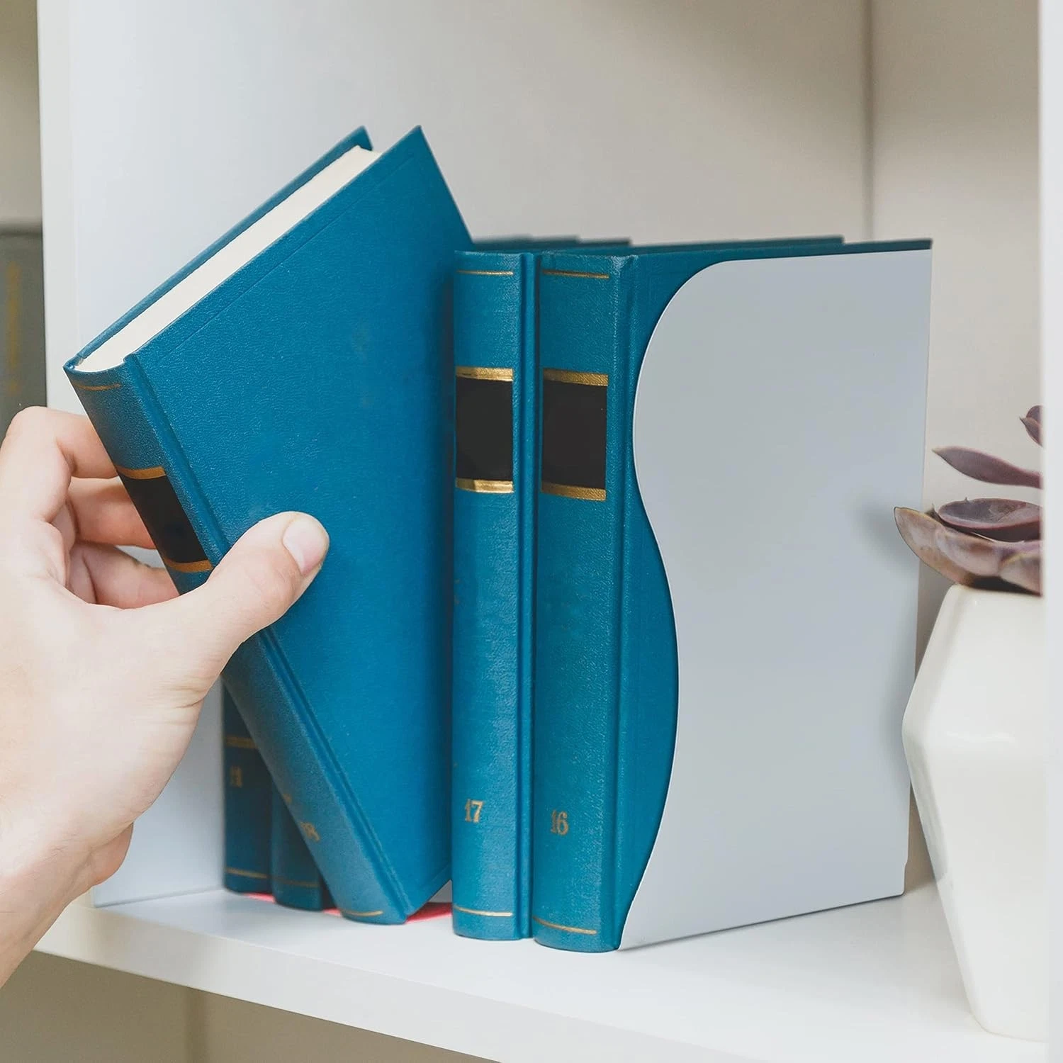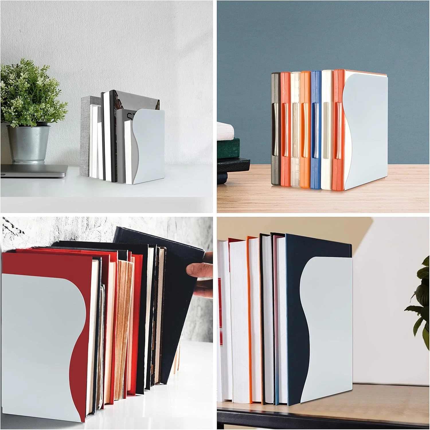 MODERN DESIGN: The bookends have a modern design and are not bulky. They are discreet and sit flush with the books you are displaying. You can hide the end of the bookend behind book covers so they will give the illusion your books are free-standing. As they are white with a simple yet elegant design, they will fit in with any home decor/theme. The design means you don't have to sacrifice aesthetics for functionality. They are very functional and can be used for many different books.