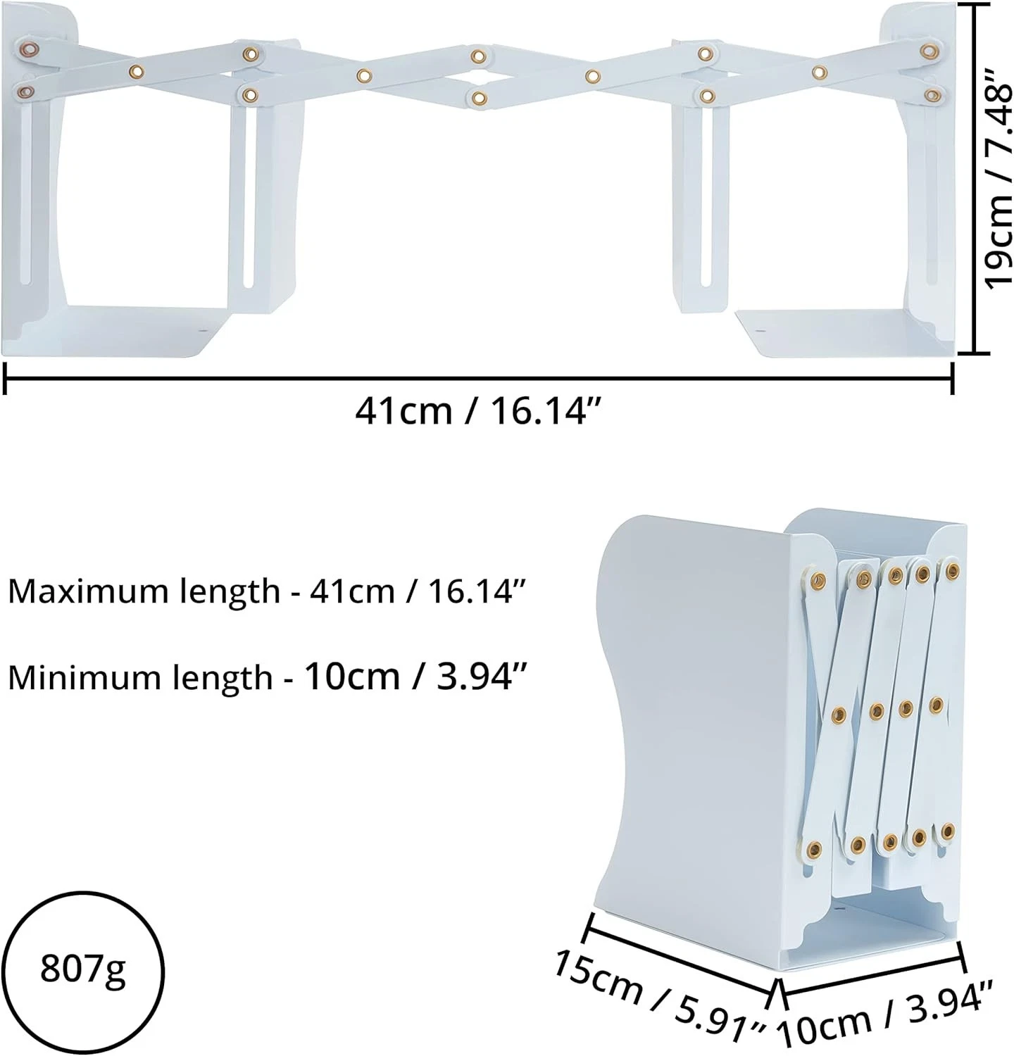 METAL BOOKENDS: Included in our set are 2 joined adjustable bookends. Each bookend is H19 x D15cm (7.48 x 5.91 inches). The length of the bookends is 10cm (3.94 inches) but can be extended to 41cm (16.14 inches). Our bookends are made from metal which is anti-rust and will not tarnish. As they are made from metal, they will not bend, break or scratch. They have a clean white finish.