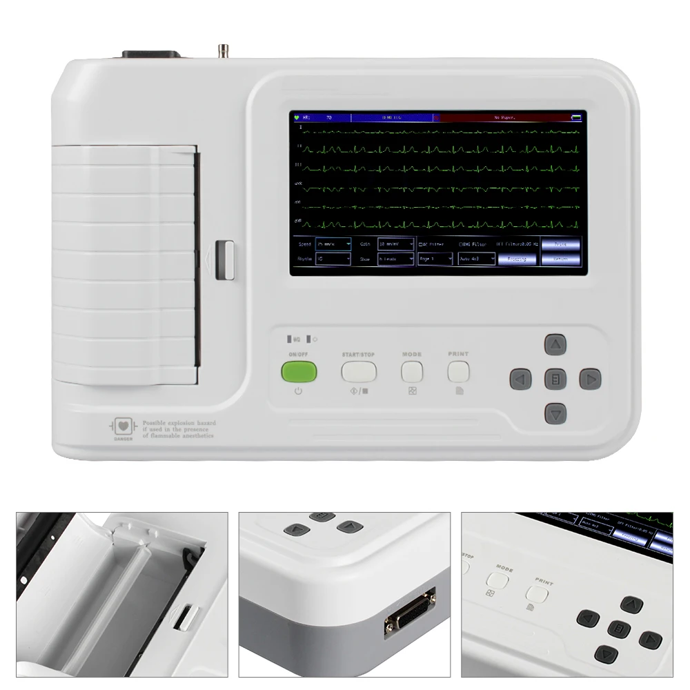 9)Display of 3/6/12-lead ECG, "Lead off" and "Lack of paper" on one screen, and with ECG DEMO mode. Auto-check and auto-analysis for ECG parameters, ECG waveform can be recorded manually or automatically. And patient information can be stored by case database.