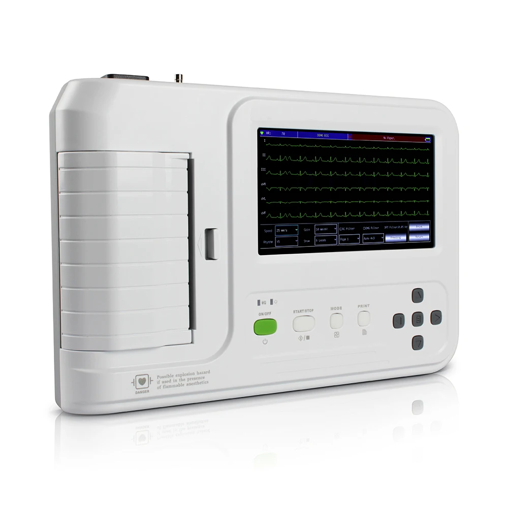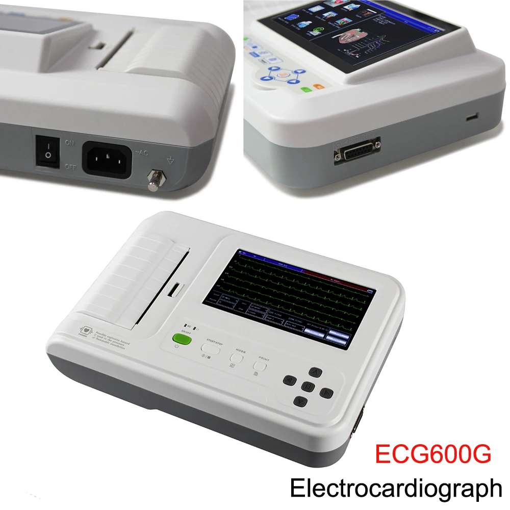 ECG600G is an Electrocardiograph which can collect 12-lead ECG signal and print waveform by the thermal printing system. It features in, recording and displaying ECG waveform in AUTO/Manual mode, measuring and diagnosing ECG waveform parameters automatically, prompting for “Lead off” and “Lack of paper”, multi-language interface, case database management.