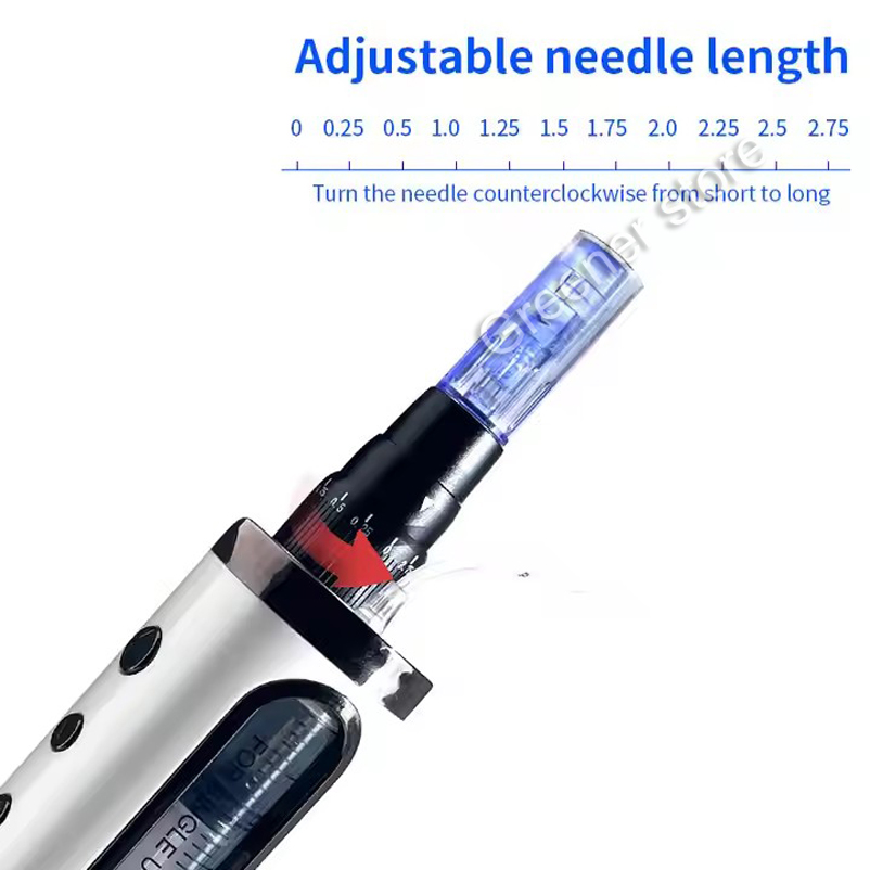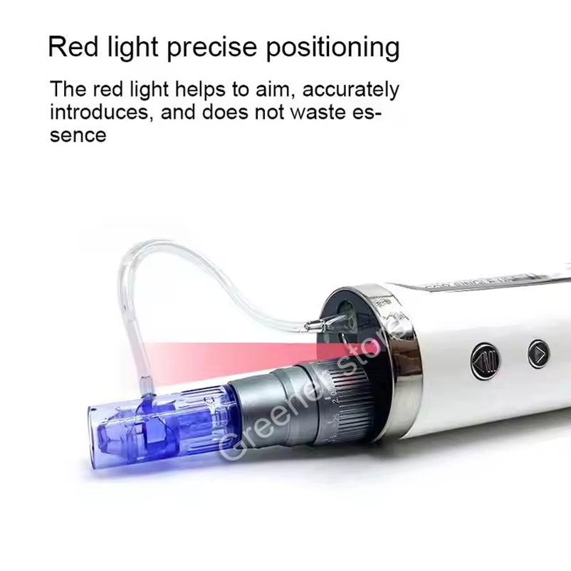 skin micro-needling device that works to tighten, lift the skin. The unique spring-loaded needle uses an automated needling motion that minimizes pain and discomfort, while better promoting an even absorption of topical serums,hyaluronic acid, hydrogenated collagen, Vitamin C and peptides into the skin.