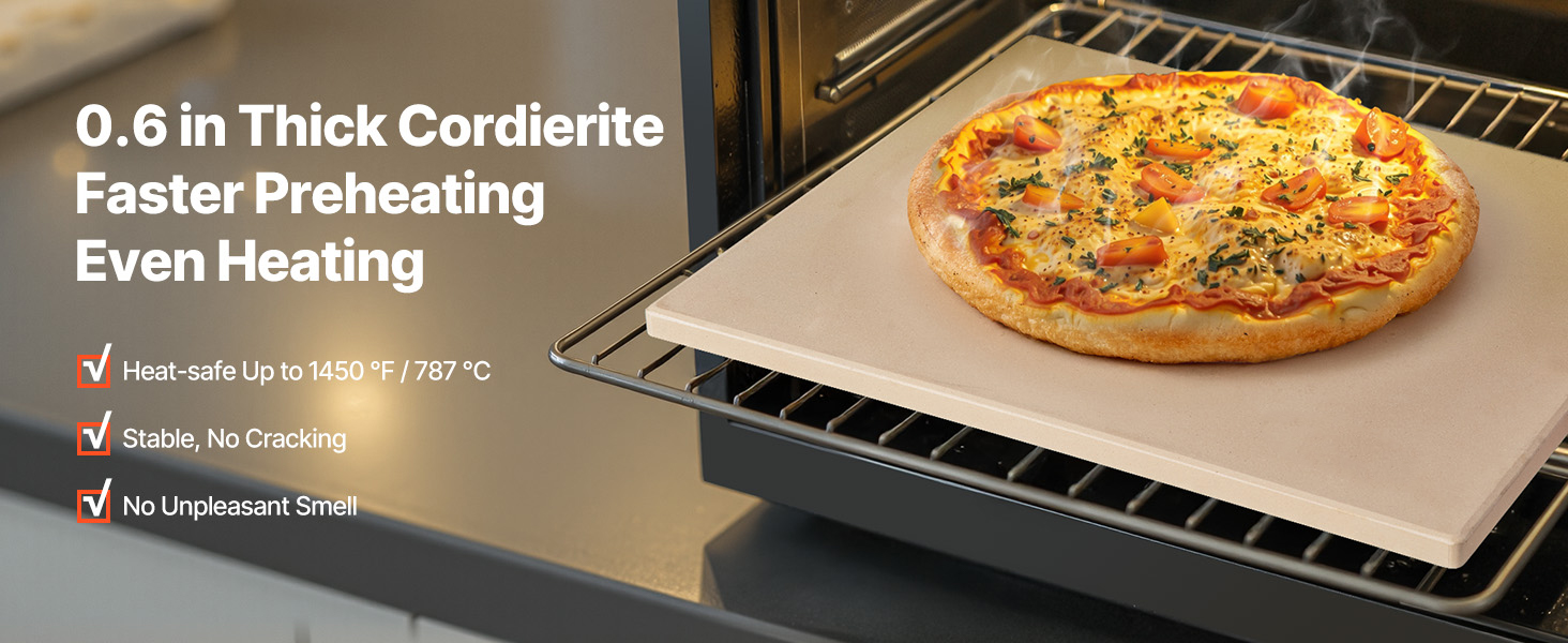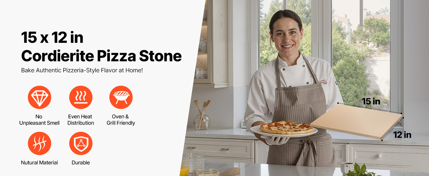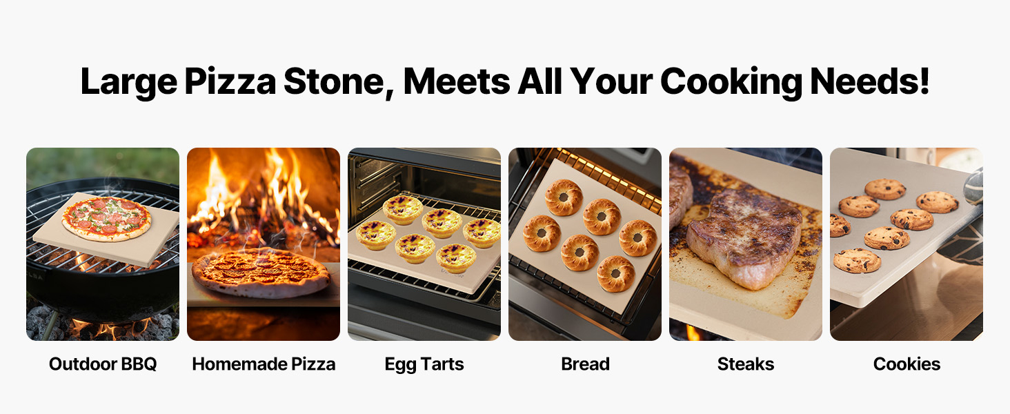 This generously sized baking stone is perfect for preparing pizza, bread, cookies, and other treats, as well as reheating food to bring back its crisp texture. Ideal for use in your home kitchen or during outdoor grilling, it enhances the flavor of your creations.