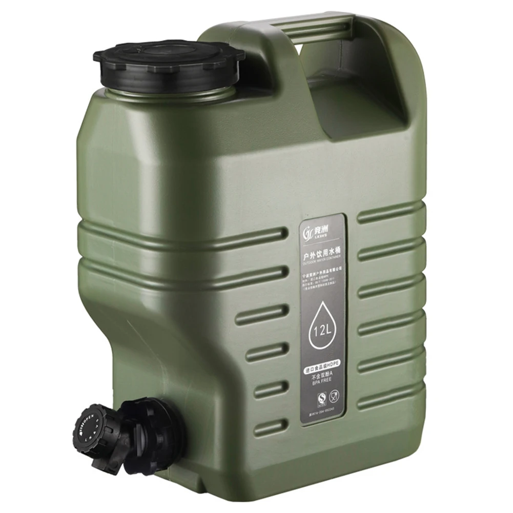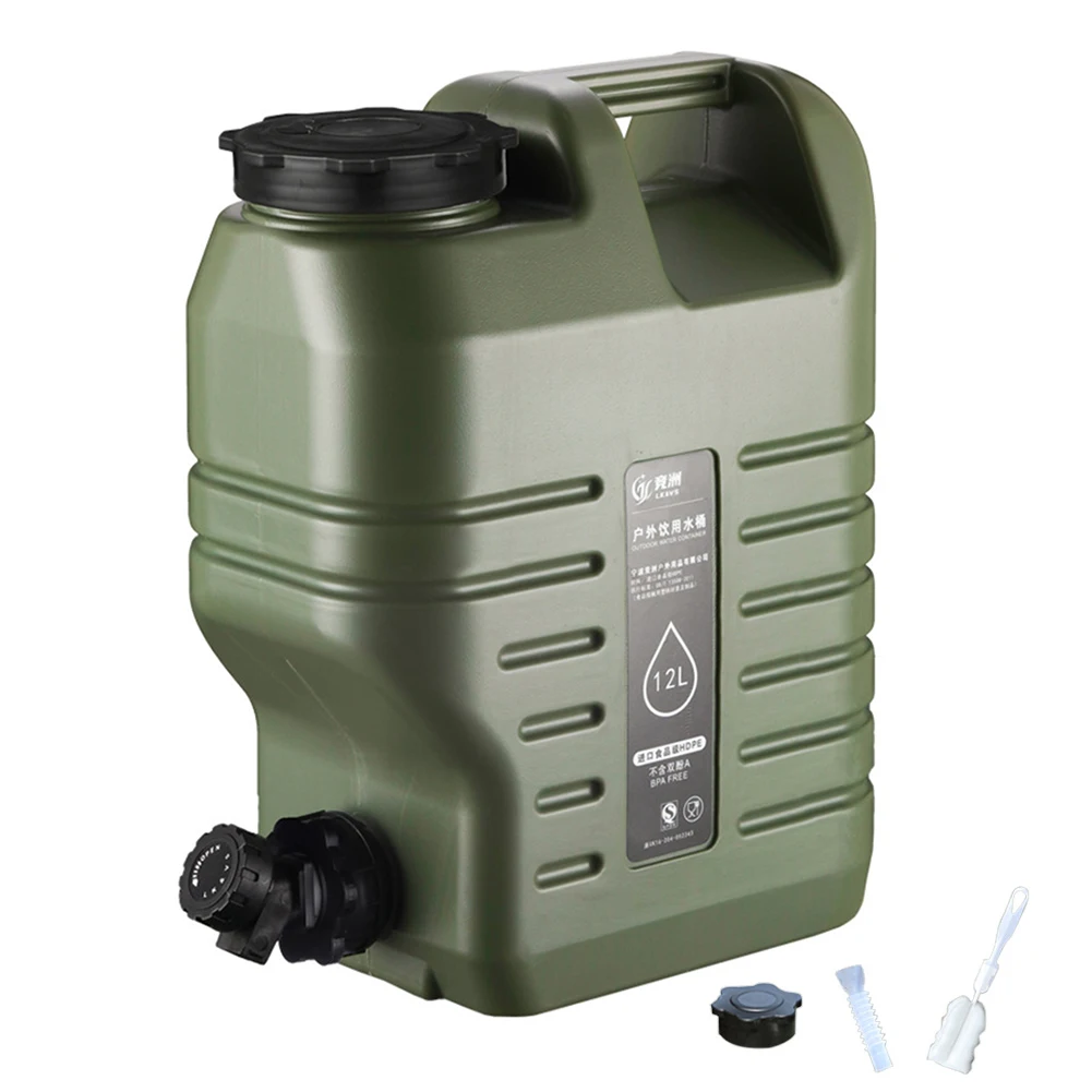 1. Food-Grade PE Material-Ensuring Safety and Purity: Our camping water container is made of food-grade PE material, free from bisphenol A (BPA). It has a uniform color, clean appearance, and is free from impurities and odors, ensuring the safety of water storage. 2. Detachable Water Tap with Sealing Cap: The water bucket comes with a detachable water tap that can be replaced with a sealing cap for better sealing performance. This allows for convenient pouring and ensures a tight seal to prevent leakage. 3. Wide 9cm Diameter Opening for Easy Cleaning and Filling: With a wide 9cm diameter opening, the water jug is easy to clean and allows for easy water filling without spillage or difficulty. 4. Thickened and Durable Construction-Slip-resistant and Corrosion-resistant: The water storage carrier features a thickened and durable construction, making it resistant to slips, scratches, impact, and corrosion. It ensures long-lasting durability and reliability in various environments. 5. Equipped with Extended Tap Hose and Convenient Storage Slot: The water tank is equipped with an extended tap hose, allowing for easy water flow control and guidance. It also features a storage slot on the side for the extended hose, providing convenient access and storage. The tap offers a large water flow rate, and its rotary knob allows for easy control of water volume. Specification: Material: Food-Grade PE (BPA-Free) Color: Army Green Size: 35cm/13.78in*30cm/11.81in*16cm/6.3in Capacity: 12L Weight: 690g Large Bucket Mouth Diameter: 9cm/3.54in