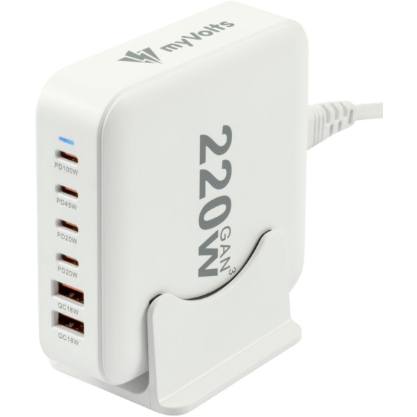 Der myVolts Step Up 6-fach USB AC Power Hub 220W bietet sechs Ladeanschlüsse: vier USB-C-Ports und zwei USB-A-Anschlüsse. Die einzelnen Ports sind unterschiedlich dimensioniert, um unterschiedliche Anforderungen optimal zu bedienen: