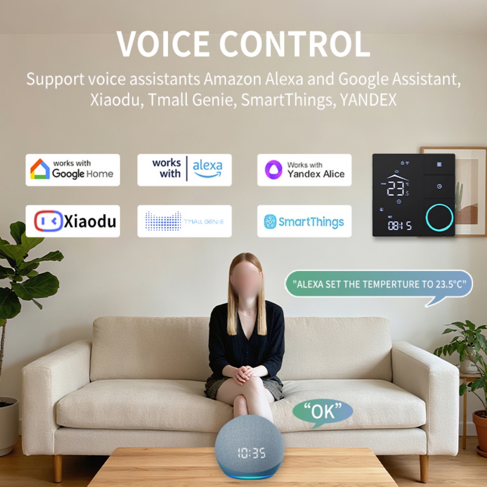 [Multi-Voice Platform Compatibility] : This smart thermostat seamlessly integrates with various voice platforms including for ALEXA and for Assistant, allowing you to control your heating system using just your voice for added convenience.