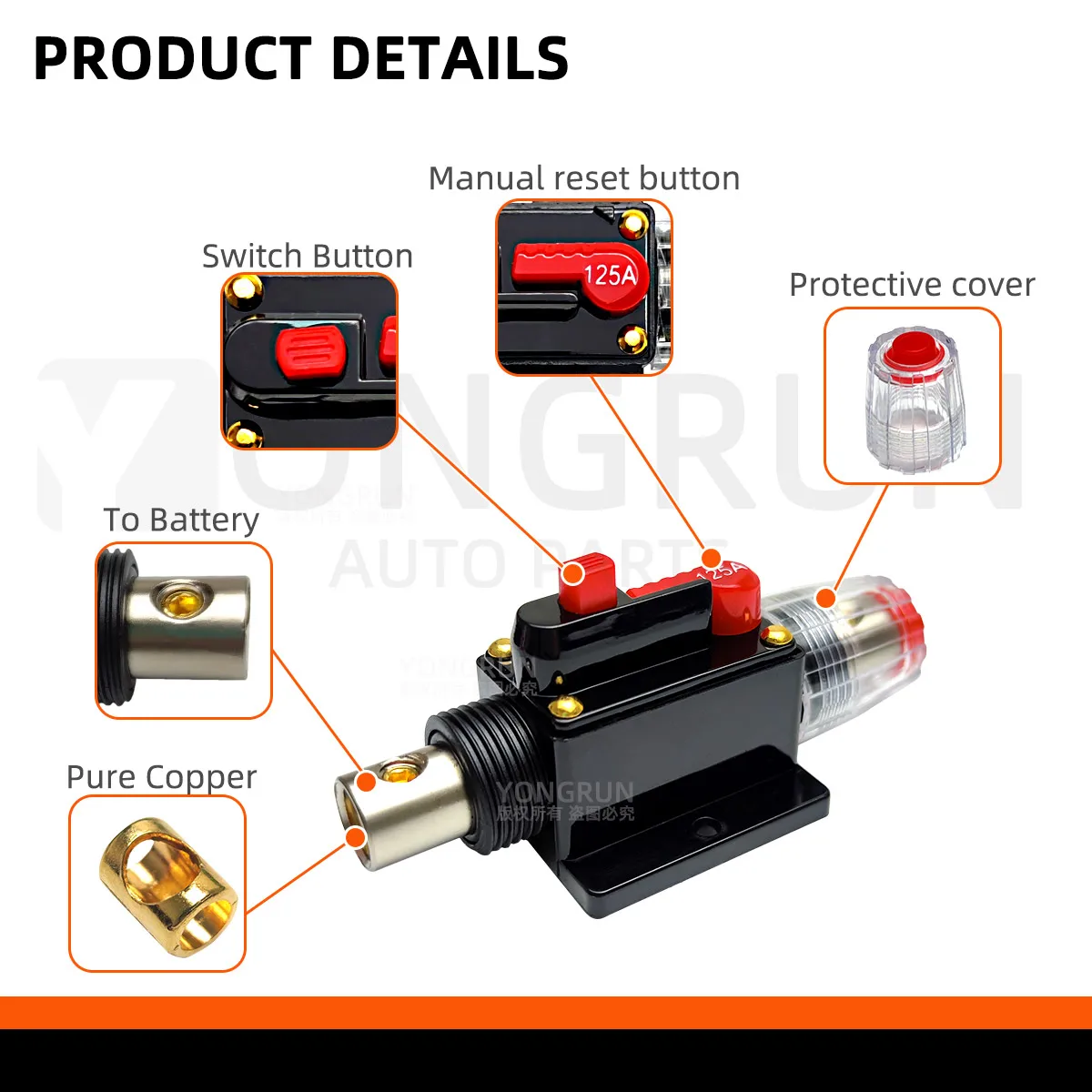 >>Product use: The circuit breaker with manual switch can be used to protect the audio amplification system, and it can also be used to protect the car power supply system to ensure that the current in the circuit will not exceed the safety value. It is compatible with DC circuit breaker in car, truck, motorcycle and marine audio system.