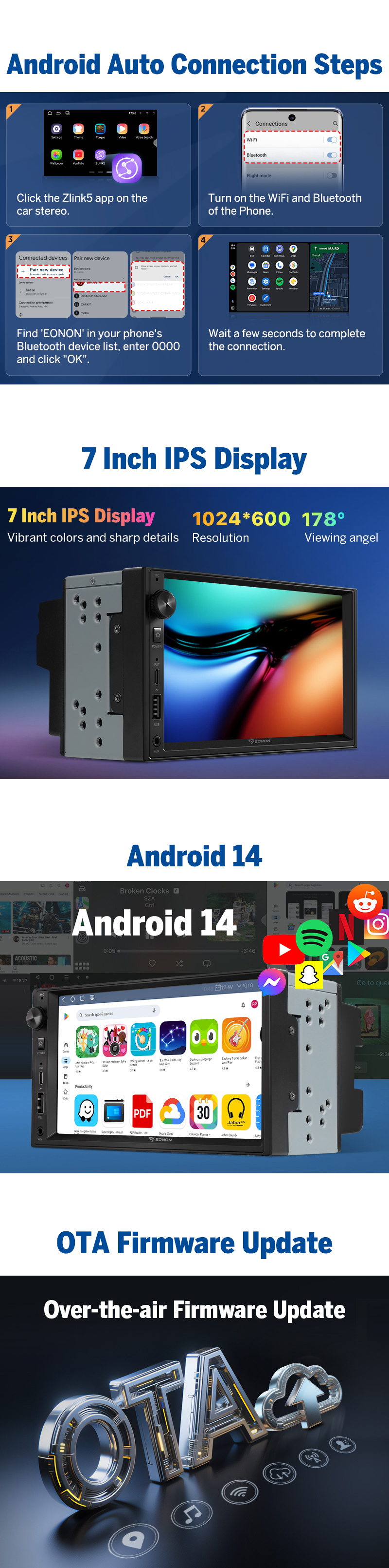 Upgrade your vehicle with the Eonon UX7, a universal 7" double DIN Android 14 head unit that transforms your dashboard into a smart, connected hub. Enjoy hands-free control, offline navigation, premium audio, multi-tasking, and OTA updates.
