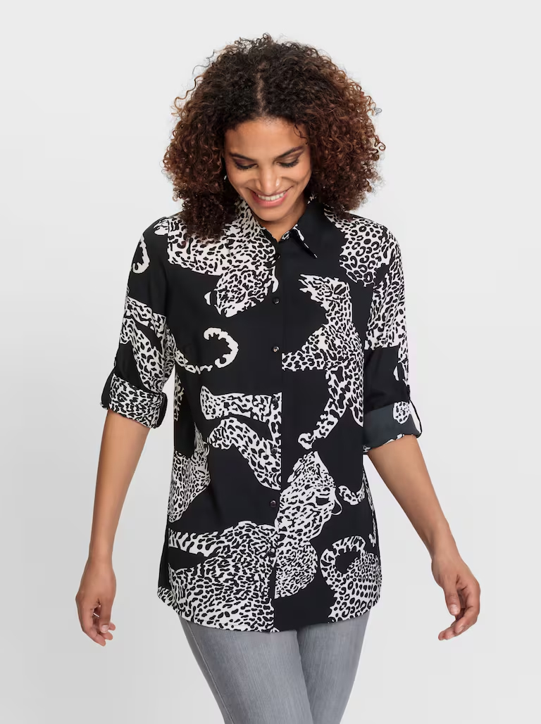 Bluse schwarz Damen Hemdbluse mit Animal-Print schwarz-ecru