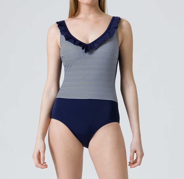 Badeanzug mit Querstreifen & Rüschenbesatz "marineblau" Gr. 46D-Cup -.3460