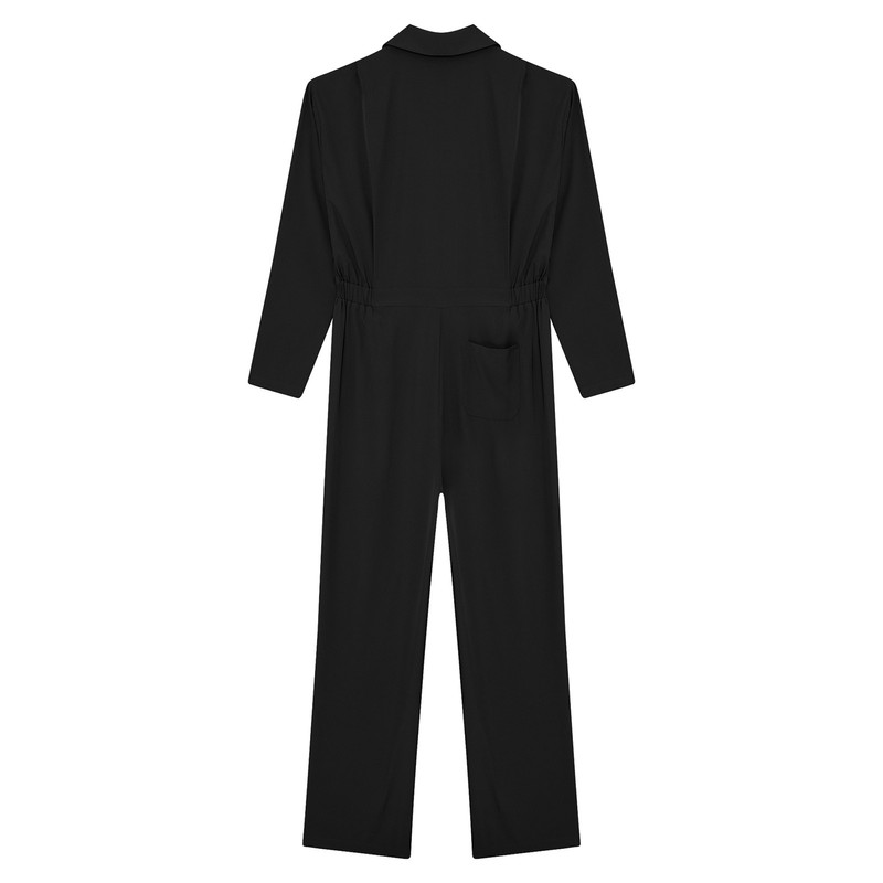 Turnover collar, long sleeve, elastic waist, high waist full length jumpsuit, front zipper closure.