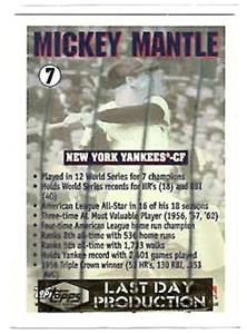 Here's a 1996 Topps Tribute Last Day Production of New York Yankees HOFer Mickey Mantle. Card #7 is mint and sealed in plastic.