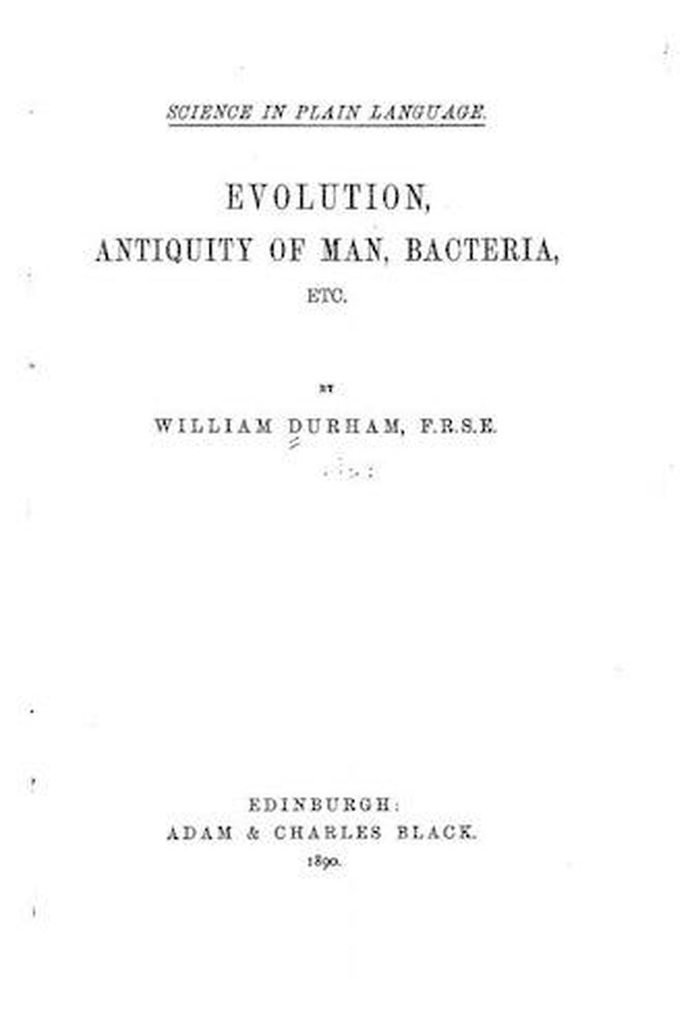 Description Evolution, Antiquity of Man, Bacteria, Etc by William Durham. This book is a reproduction of the original book published in 1890 and may have some imperfections such as marks or hand-written notes.