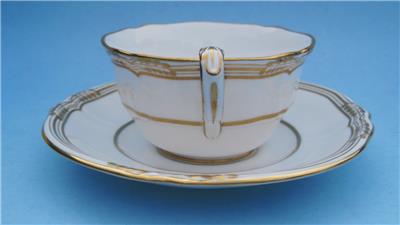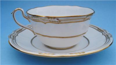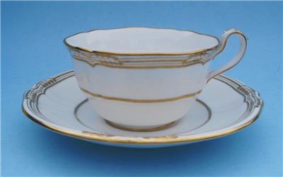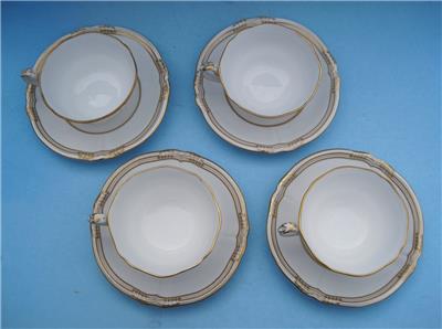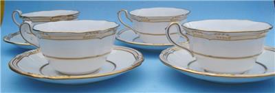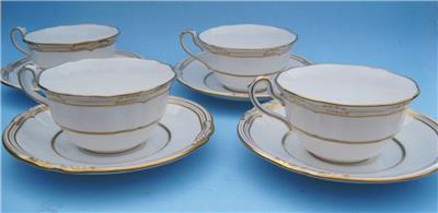Here is a set of 4 Bone China Footed Cup and Saucers sets in the Sheffield pattern by Spode. Saucers and cups are white with scalloped edge and gold trim. This pattern was produced from 1962-2009. Pattern number R568.