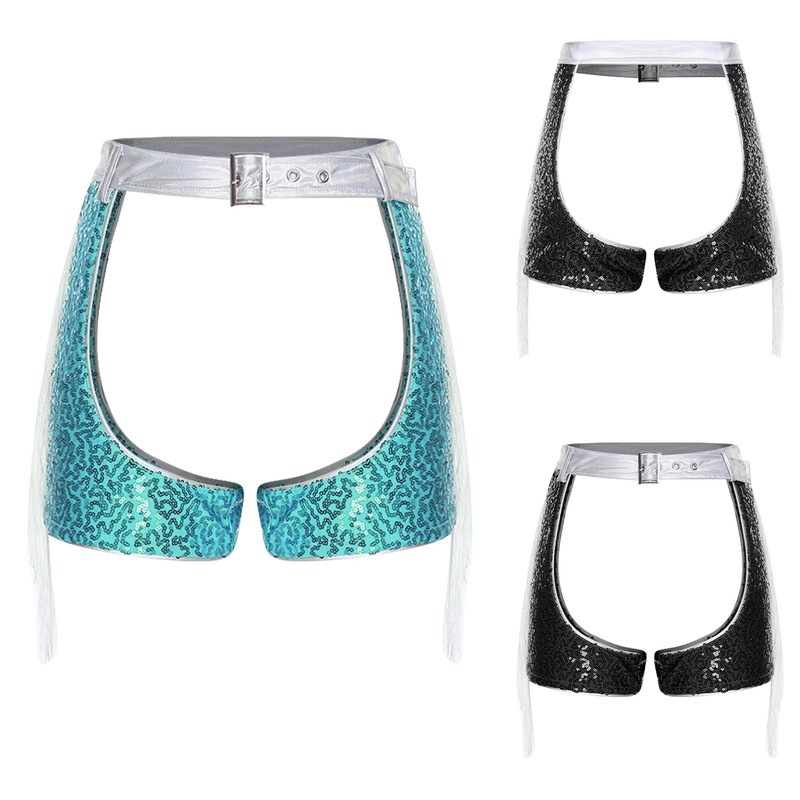 Womens Shiny Fringed Open Crotch Chaps Shorts Adjustable Waist Hollow Out Shorts