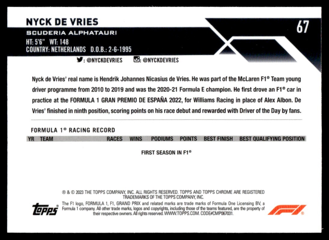 | 2023 Topps Chrome Formula 1 Sapphire Nyck De Vries RC Scuderia AlphaTauri #67 |