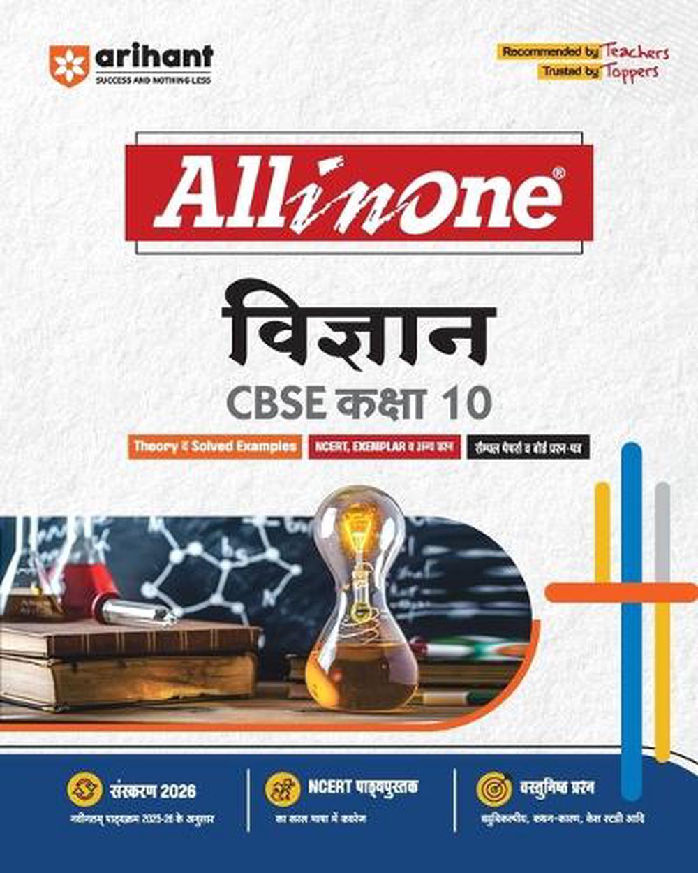 SERIES INTRODUCTIONArihant's All-in-One series has been the #1 choice of students and teachers for over a decade. Known for its well-structured content, exam-oriented approach, and easy-to-understand language, this series ensures complete concept clarity and thorough practice. Each book is meticulously crafted to align with the latest CBSE syllabus and exam pattern, making it a trusted companion for students aiming for academic excellence.FOR WHOM IS THIS BOOK FOR?Class 10 studentsFEATURES TO HELP YOU TO SUCCEEDComplete NCERT coverageBased on the Latest Syllabus 2025-26Chapter Intro containing quick information about the coverage of the chapterSimplified Theory in each chapter and well supported by Definitions, Facts, Figures, Flowcharts, etc.Solved Examples are given in between the theory to learn the problem-solving process completelyTry These provides a set of 3-5 questions in between the text to help students remain connected with the text while studyingNCERT Folder containing complete explanations of all the questions of NCERT exercisesNCERT Exemplar Problems are selected and included for practiceMind Maps for a quick revision visual tool for the complete chapterIllustrative Figures to make the concepts completely visibleReview Practice contains exam pattern questions of all typesAssessment Exercise brings a complete test of the chapter in exam formatSelected Board Exams Questions from the last 6 years Board Exams to boost confidenceCBSE Examination Papers 2024 & 2025 and Sample Question Papers at the end are exactly prepared on the latest syllabusExperiments are given at the endWHAT'S NEW ADDED?Focused TheoryPractice ExercisesSample PapersDetailed Theory in easy to understand mannerVaried types of competency-based questionsHOW WILL THIS EDITION BENEFITS?Latest CBSE Syllabus 2025-26- Ensure up-to-date content with recent changesFocused theory- Simplifies learning with structured explanations and visual aidsCompetency-Based Questions- Strengthens critical thinking and problem-solving skillsAmple Practice Exercises- Includes CBQs, all types of questionsComplete Exam Preparation- Offers sample papers to enhance exam readinessTABLE OF CONTENTSChemical Reactions and Equations, Acids, Bases, and Salts, Metals and Non-Metals, Carbon and Its Compounds, Life Processes, Control and Coordination, How Do Organisms Reproduce, Heredity, Light: Reflection and Refraction, Human Eye and the Colorful World, Electricity, Magnetic Effects of Electric Current, Our Environment, Experiments, CBSE Examination Papers 2025, Sample Question Papers (1-3)