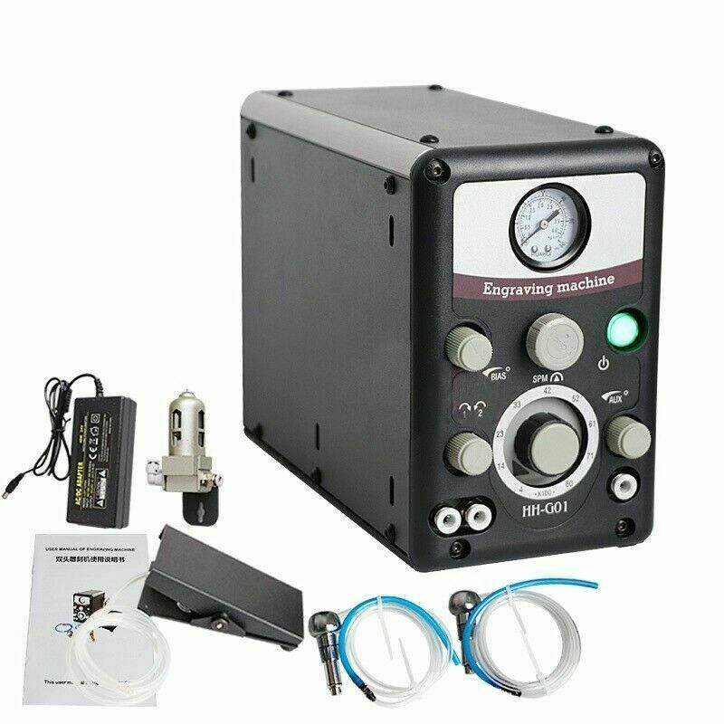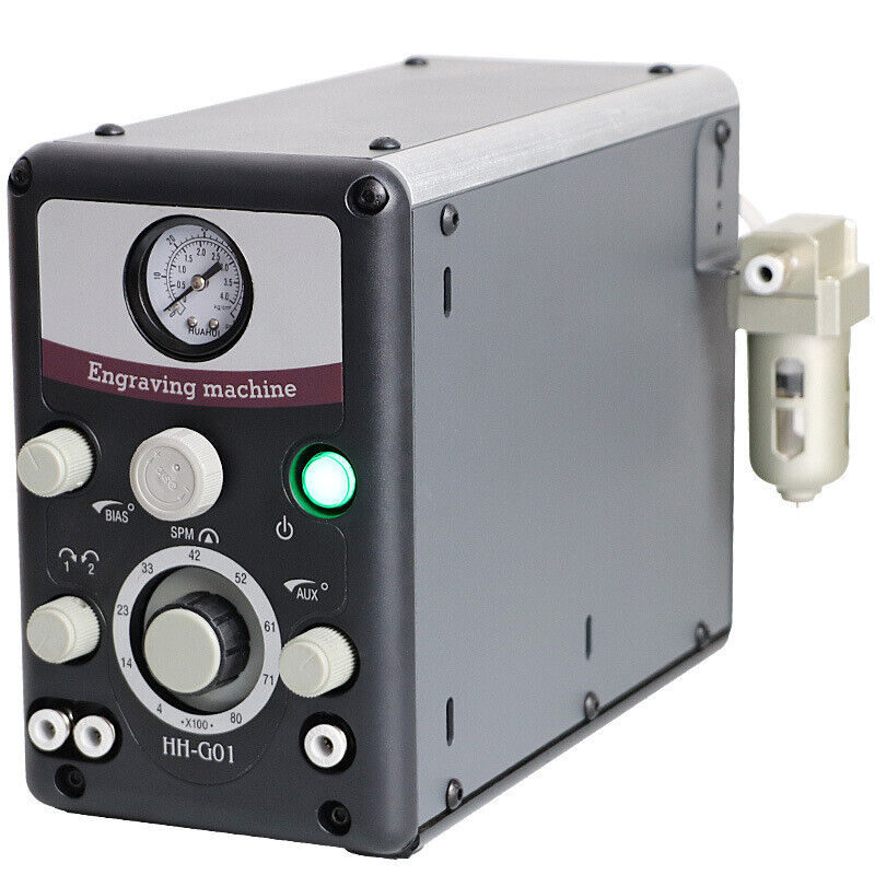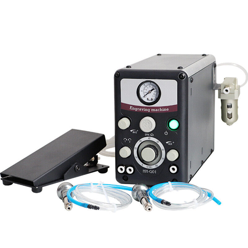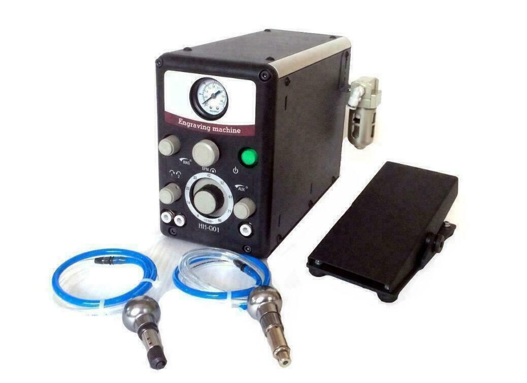 The pneumatic engraver features 400-8000 strokes per minute, a throttle bias adjustment valve for tailoring throttle response; a dual-stage precision air regulator.