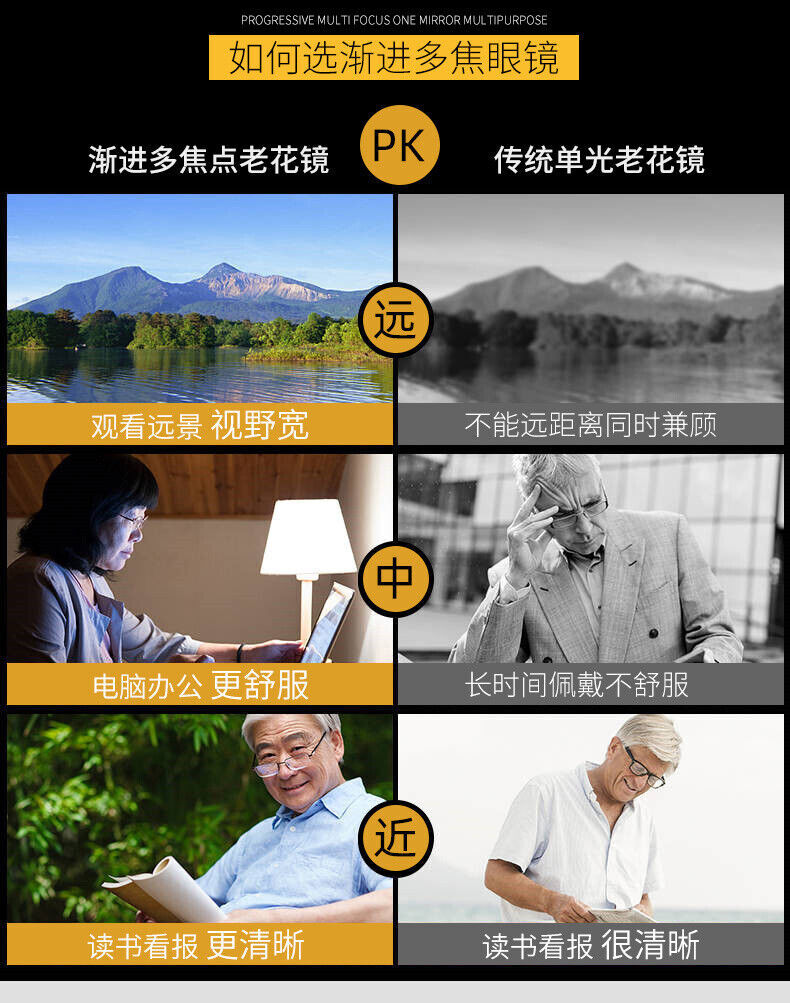 The lenses usually have different strengths and can help the elderly see nearby objects and texts more clearly.
