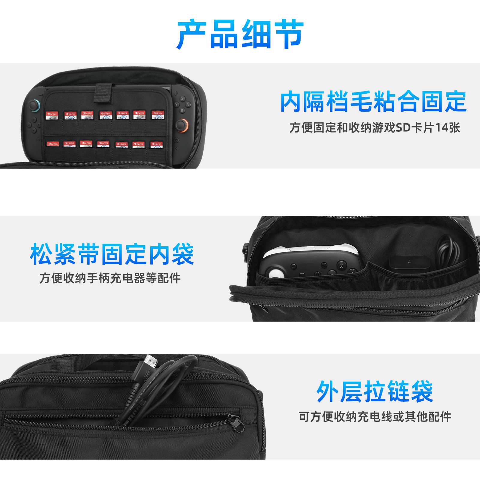 5. Elastic-banded inner pocket for accessories like chargers. Additional inner compartment with elastic bands securely holds up to 14 game SD cards;
