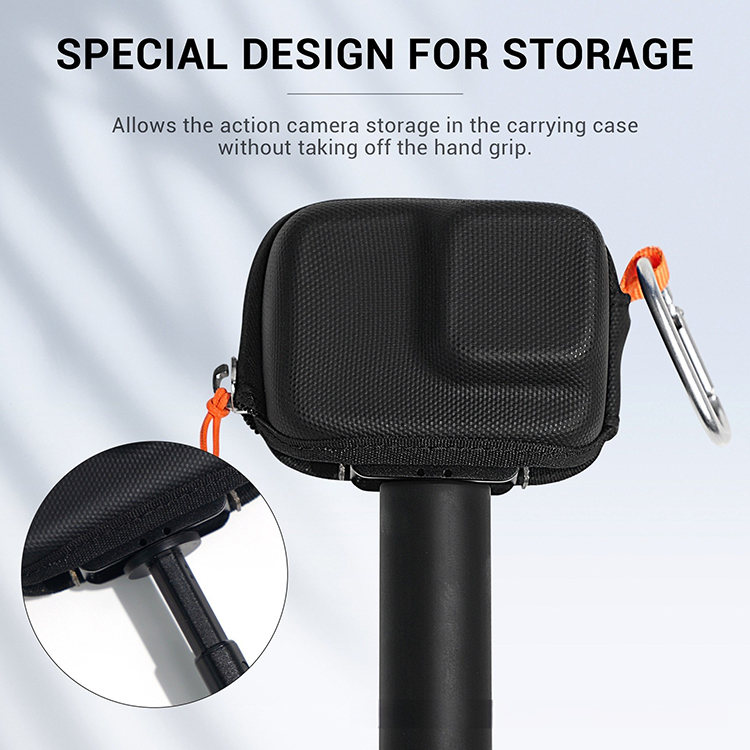 Allows the action camera storage in the carrying case without taking off the hand grip