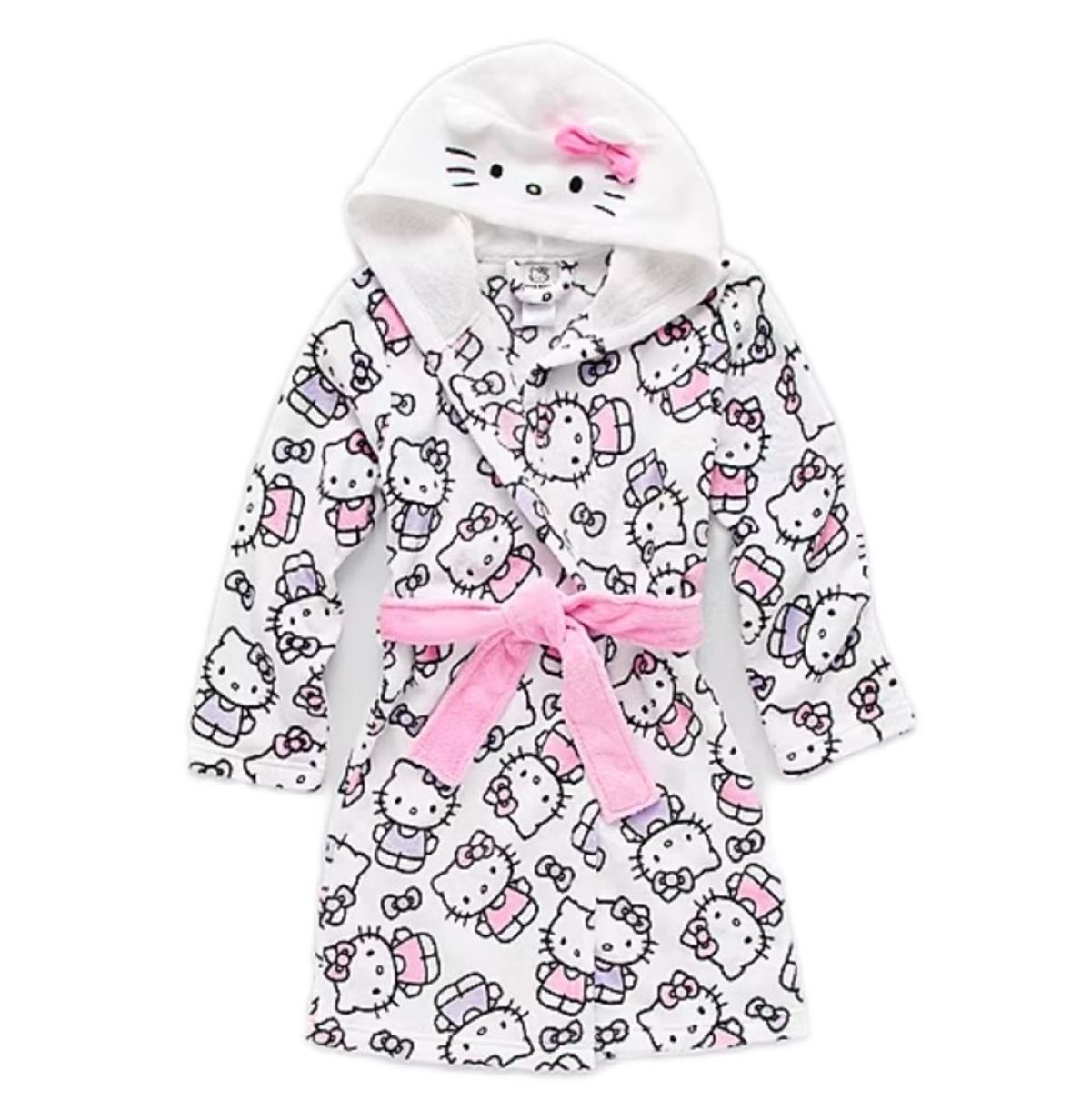 This Hello Kitty hooded bathrobe offers exceptional softness and comfort, perfect for any Hello Kitty enthusiast. It showcases a delightful print of Hello Kitty in her pink and purple dress and bow ensembles, bringing a playful touch to the design. The costume-style hood, adorned with adorable Hello Kitty features and a fabric pink bow, enhances its charm. Additionally, the bathrobe includes an attached tie front belt for a secure fit. Made from high-quality, super soft, and cozy minky fleece, it is crafted from 100% polyester, ensuring long-lasting comfort.