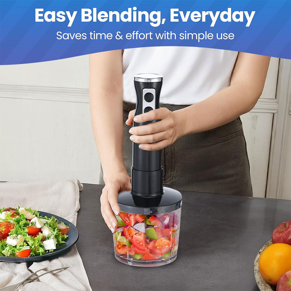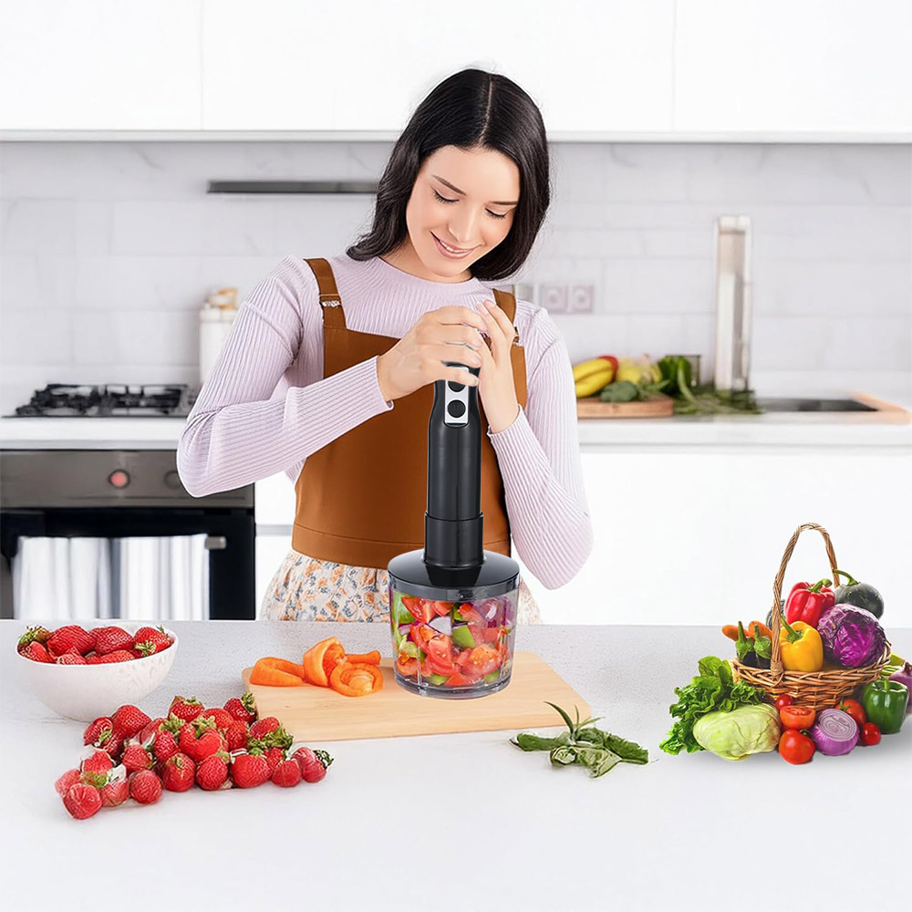 Multifunction Hand Blender: 4-In-1 Control your blending with two speed settings plus pulse motion,4 attachments: Stainless Steel blending leg, 500ml chopping bowl & Whisk &700ml cup attachment. It can be used to make delicious and healthy smoothies, sauces, salads, whipped protein powder and baby food