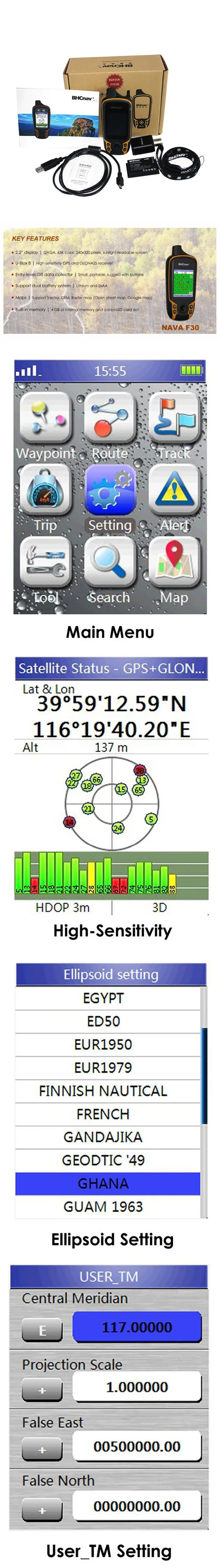 Description: NAVA F30 is a handheld GPS and GLONASS receiver, with its high-sensitivity, WAAS, EGNOS, GAGAN, MSAS-enable GPS receiver, NAVA F30 locates your position quickly and precisely and maintains its GPS location even in heavy cover and deep canyons. NAVA F30 has an enhanced 2.2", 65K color, 240x320 pixels, sunlight-readable display. Durable, portable and waterof. Worldwide basemap preloaded, and NAVA F30 also supports Vector map (City detail map), DEM map, and Raster map. NAVA F30 lets you share your waypoints, tracks, routes in multiple GPS data formats, including GPX, SHP, MIF, CSV, KML, DXF, and TXT via NAVA GPS Office software. NAVA F30 is an ideal rugged GPS and GLONASS receiver for a large range of applications from Agriculture, Forest and Biology, Mining, Surveying, Nautical, Hydrographic studies, Engineering disciplines,Geographical (GIS) and Urban information systems,Municipalities and Public works directorates, Electricity, Electronics, Geological studies, Sporting, National Real Estate-land survey directorates, Remote sensing, Public sector and institutions, Planning and First draft jects, Military...